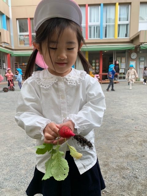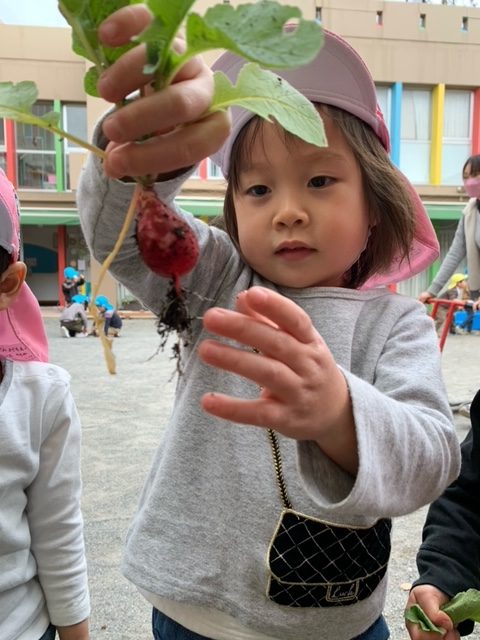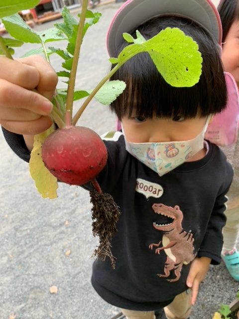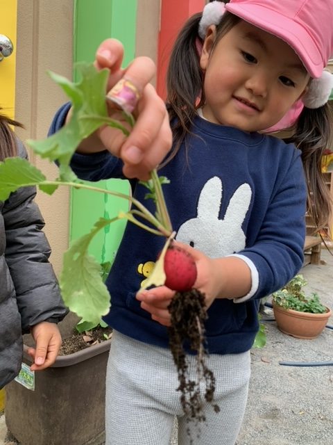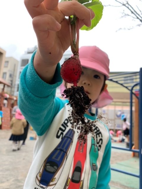 小さな赤かぶ 今日のひとこま 2021.12.07 ゆり組さんは「大きなかぶ」の歌が大好きです♪ 喜んで歌っているゆり組さんは、今日プランターにできた小さな赤かぶをとりました。 木曜日のスープに入るそうです。 楽しみですね!