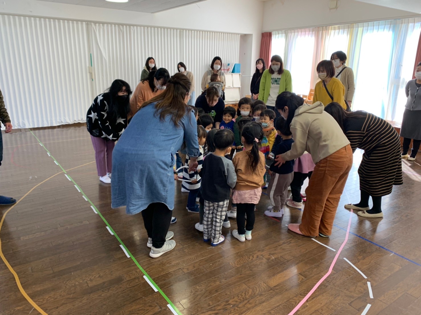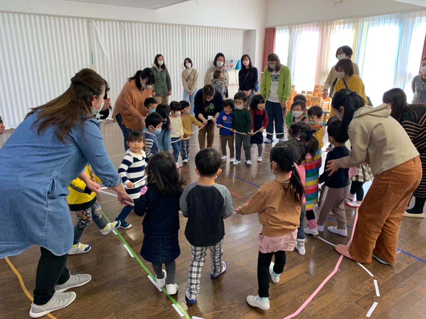 次は大きなたいこ、小さなたいこに合わせて大きな丸になったり小さな丸になったり、みんなで一つの動きができてとても上手でした。