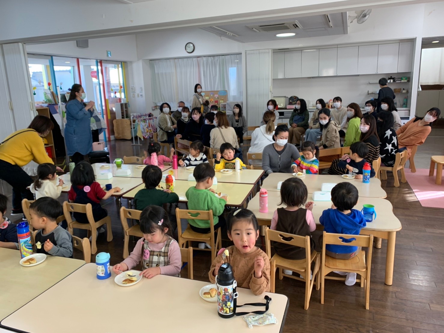 今日からおうちの方と離れて、おともだちと一緒におやつをいただきました。