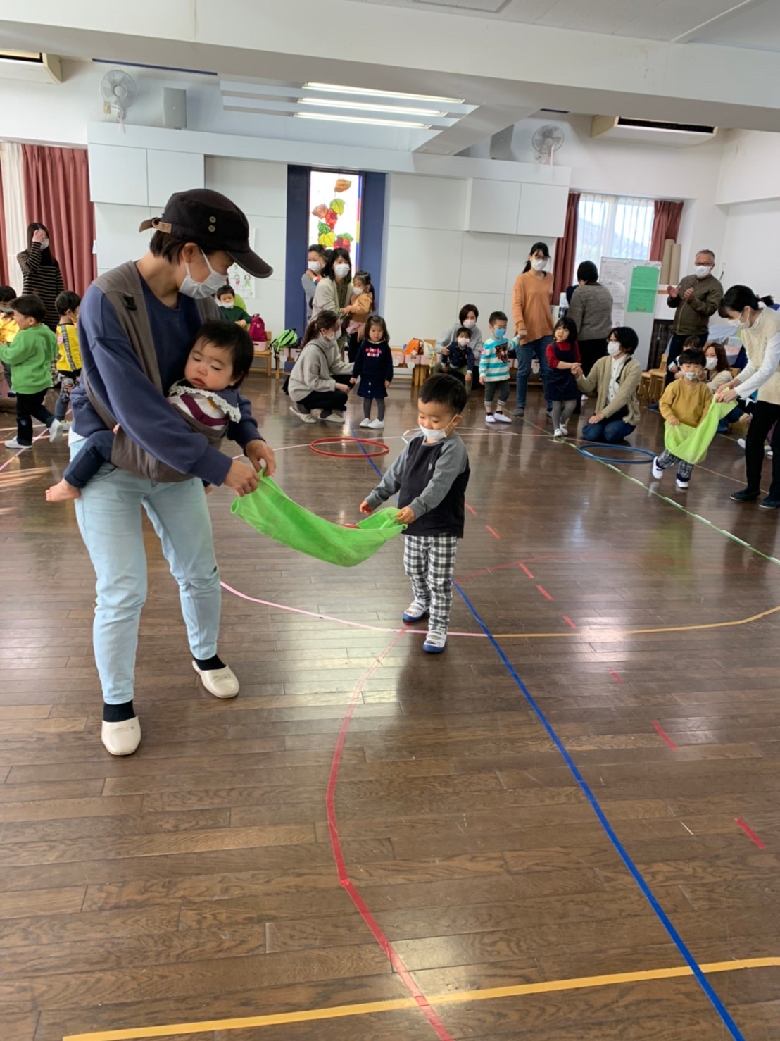 慎重な子、大胆な子、それぞれに楽しみながら、おうちの方と息を合わせて運ぶことができました。