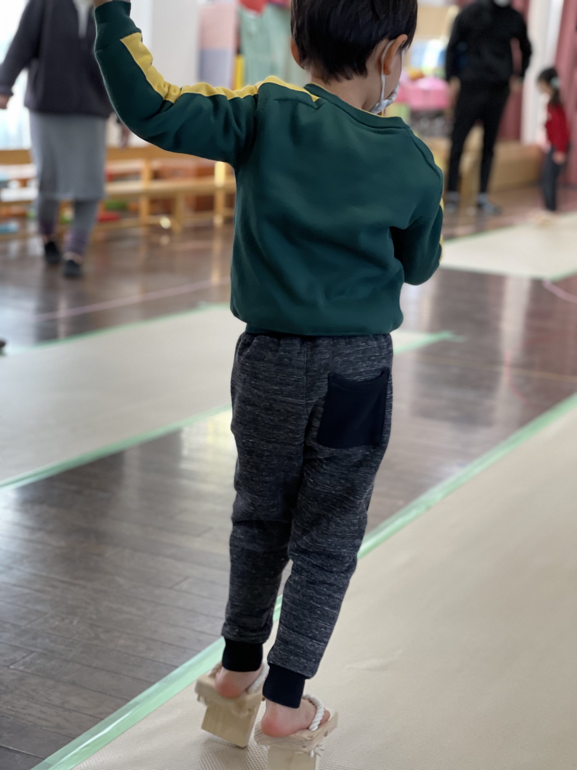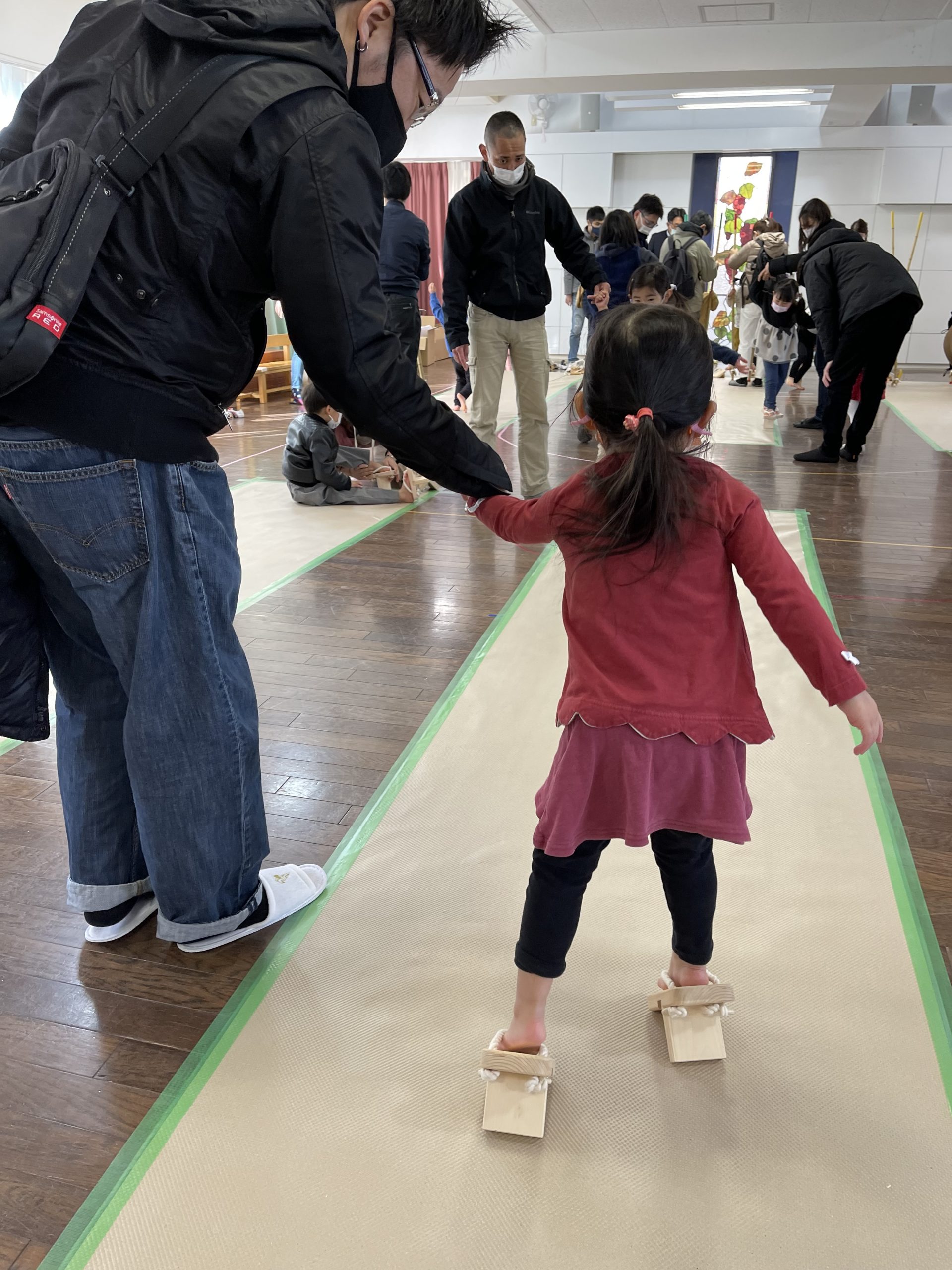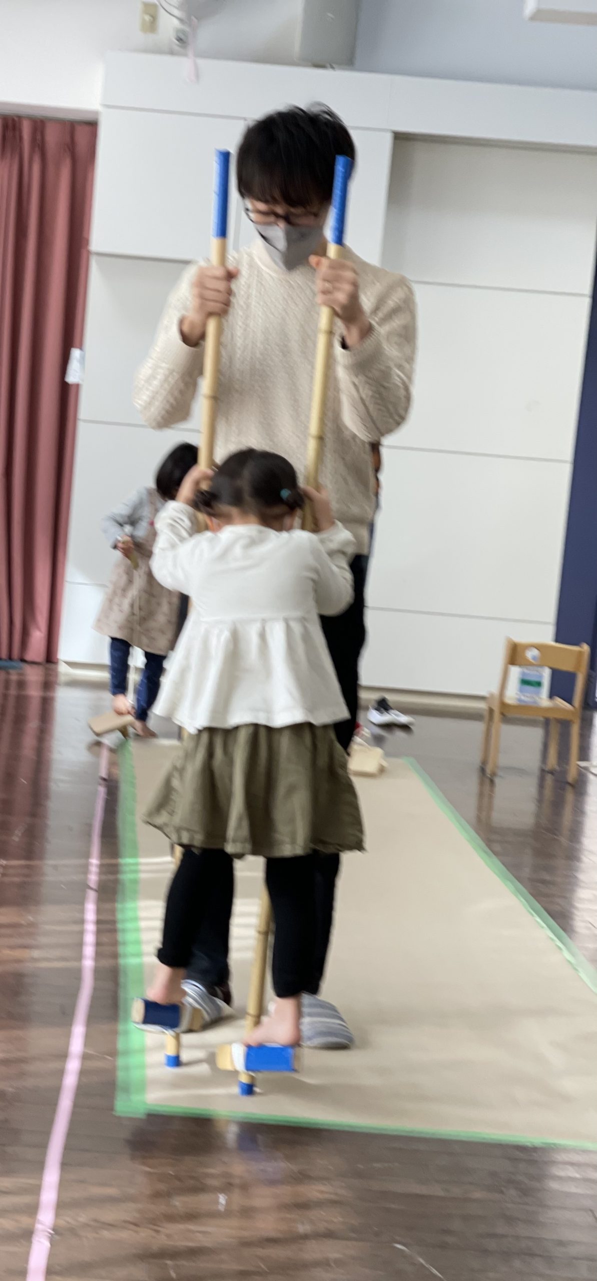 今日は3年ぶりの『プレイデー』でした。今回のプレイデーはエール株式会社から斎藤先生に来ていただき、『安田式遊具』紹介していただき、親子で鉄棒・平均台、ぽっくり・竹馬、下駄に挑戦しました。