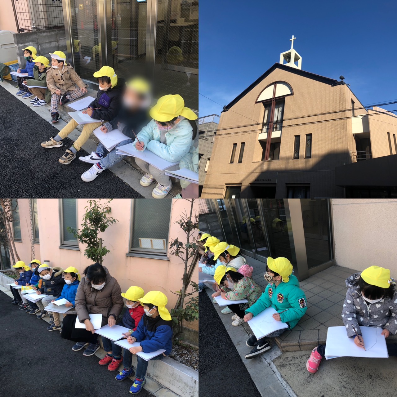 さくら組の子どもたちは、アルバム製作に取り組んでいます。今日は裏表紙にはる教会の絵を描くために、幼稚園の向かいのハートさんの前でスケッチをしました。「ライトがあるよ!」「窓の数は、、」とよく観察して描いてました。2階の窓が開き、友納園長先生が手を振ってくれて、嬉しかったですね。寒さに負けず、元気な子どもたち!さくら組の子どもたちのたくましさを感じた1日でした。明日も元気に登園できますようにお祈りしてます。