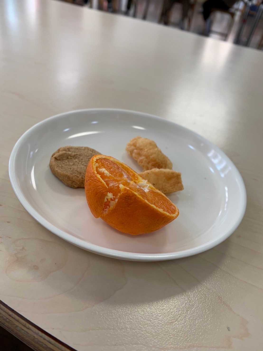 今日はきなこクッキー、おかき、みかんをいただきました。