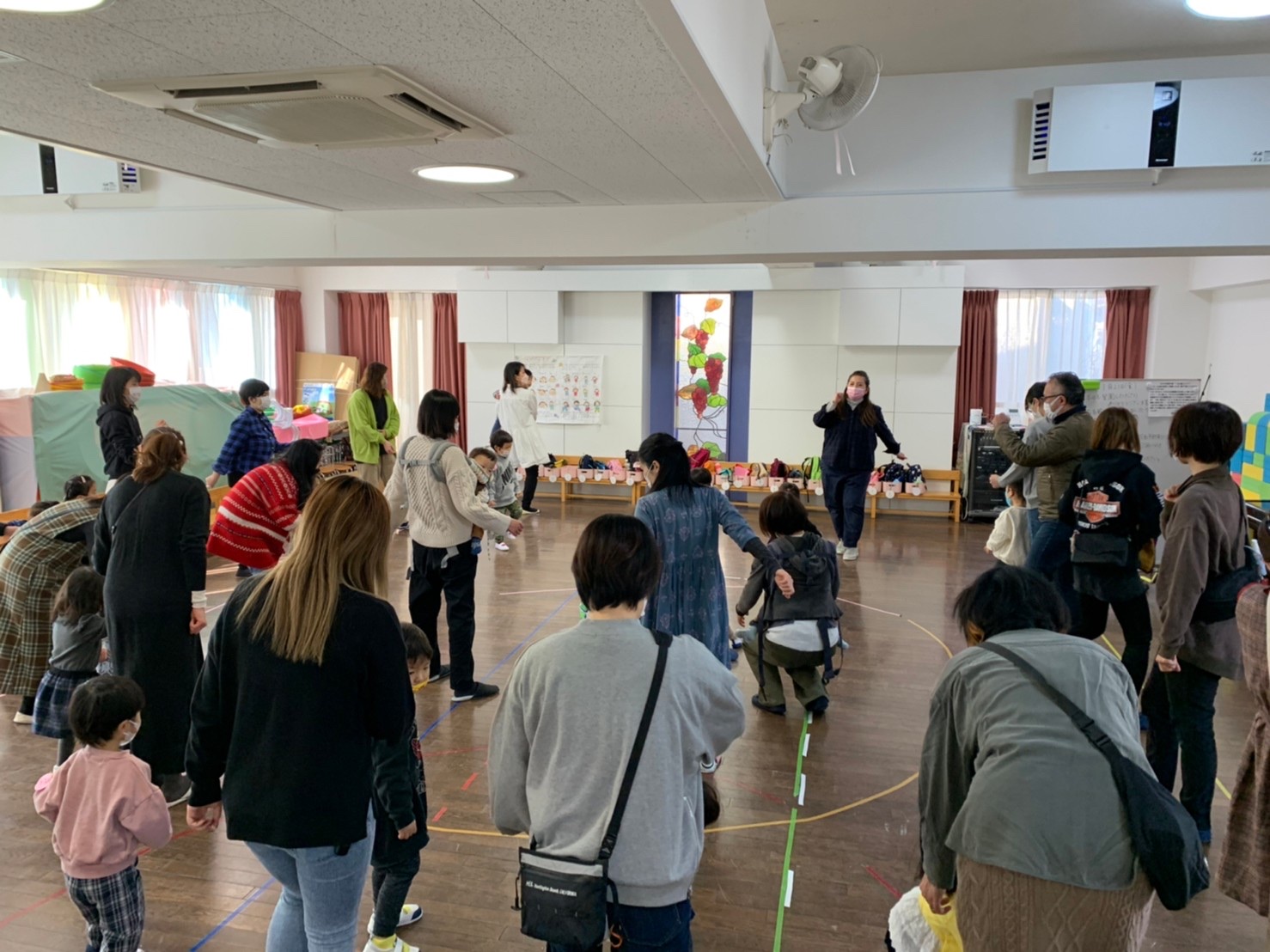おうちの方と一緒に、音に合わせて行進をしました。