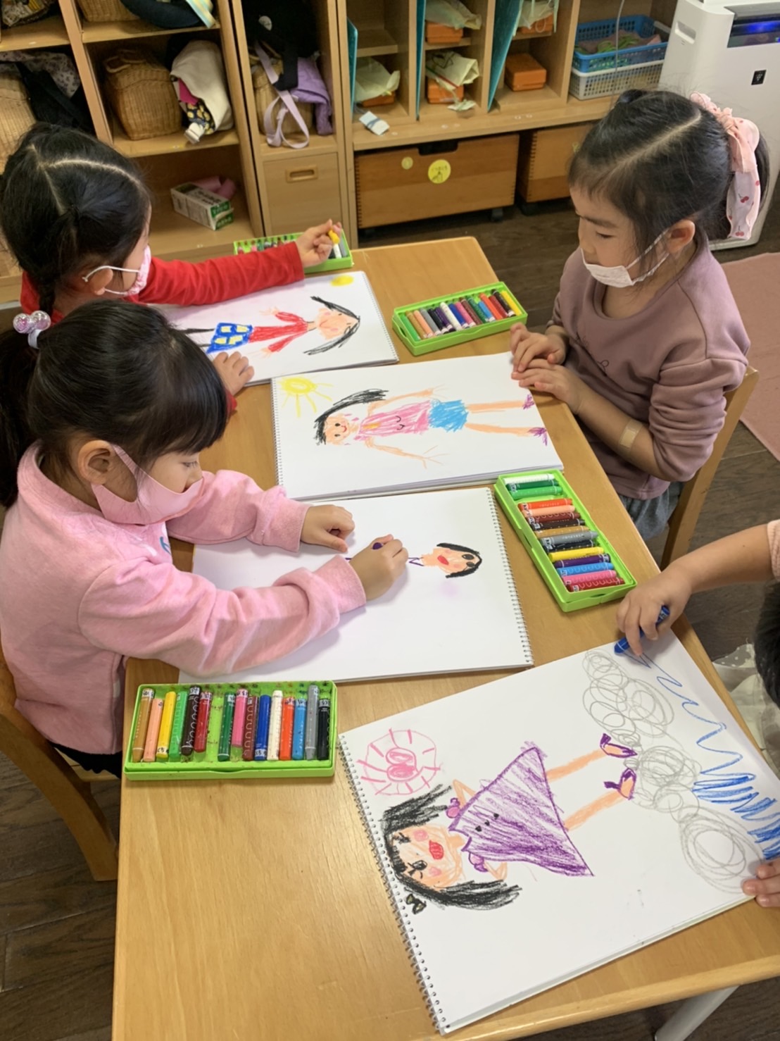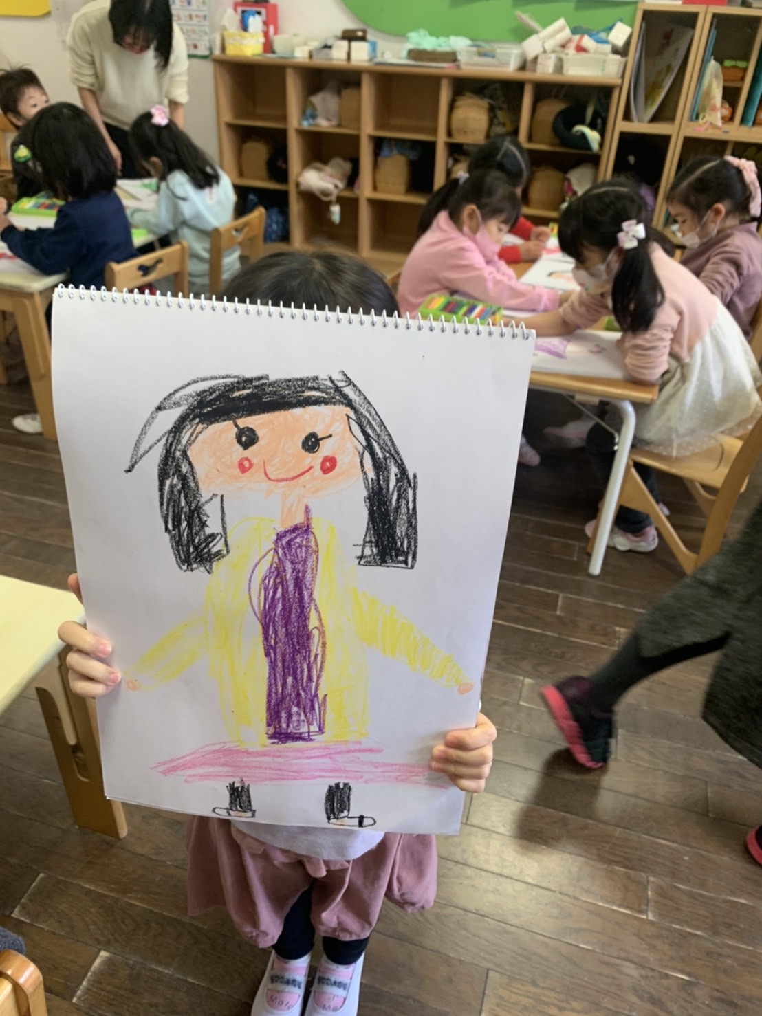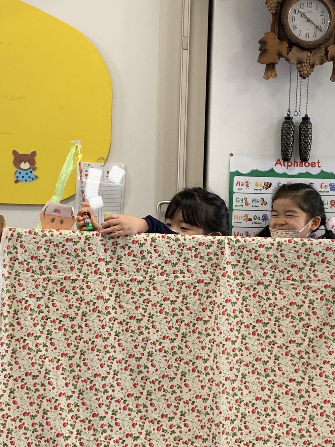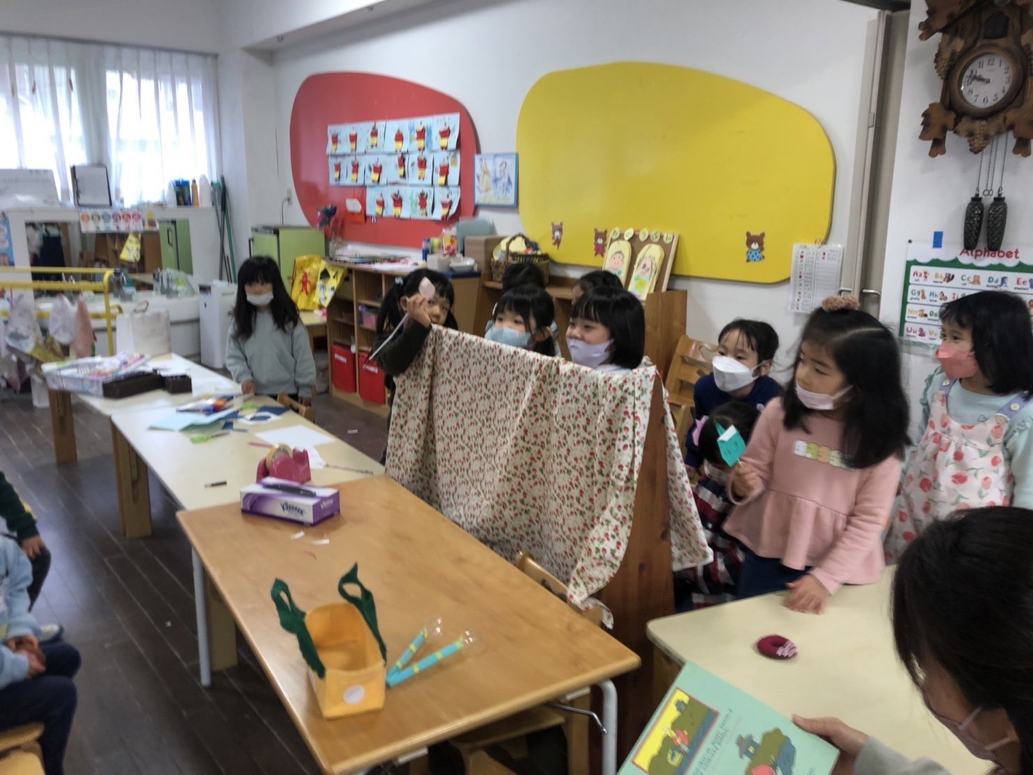 たんぽぽ組では、毎日、好きな遊びをお友だちと楽しむ姿が見られます。最近は、折り紙で鬼を折ったことから、鬼が出てくる「桃太郎」のペープサート遊びが始まりました。自分たちでいろんな色の鬼を作って、とても楽しそうです。他のクラスからもお客様がたくさん来てくれました!