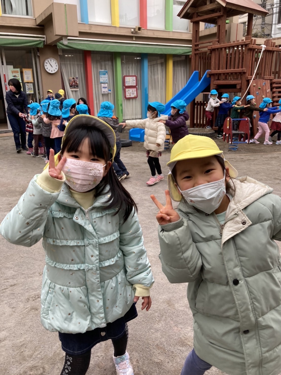 今日は水曜日。寒さに負けず、体操をしました。元気よく体を動かして、暖かくなりました。