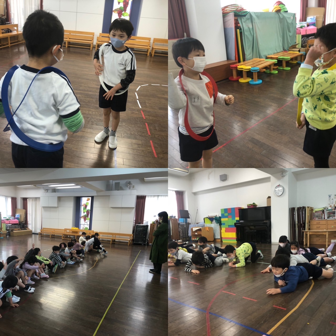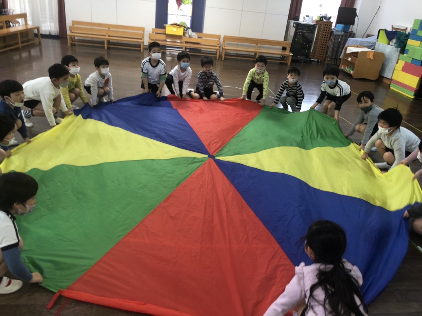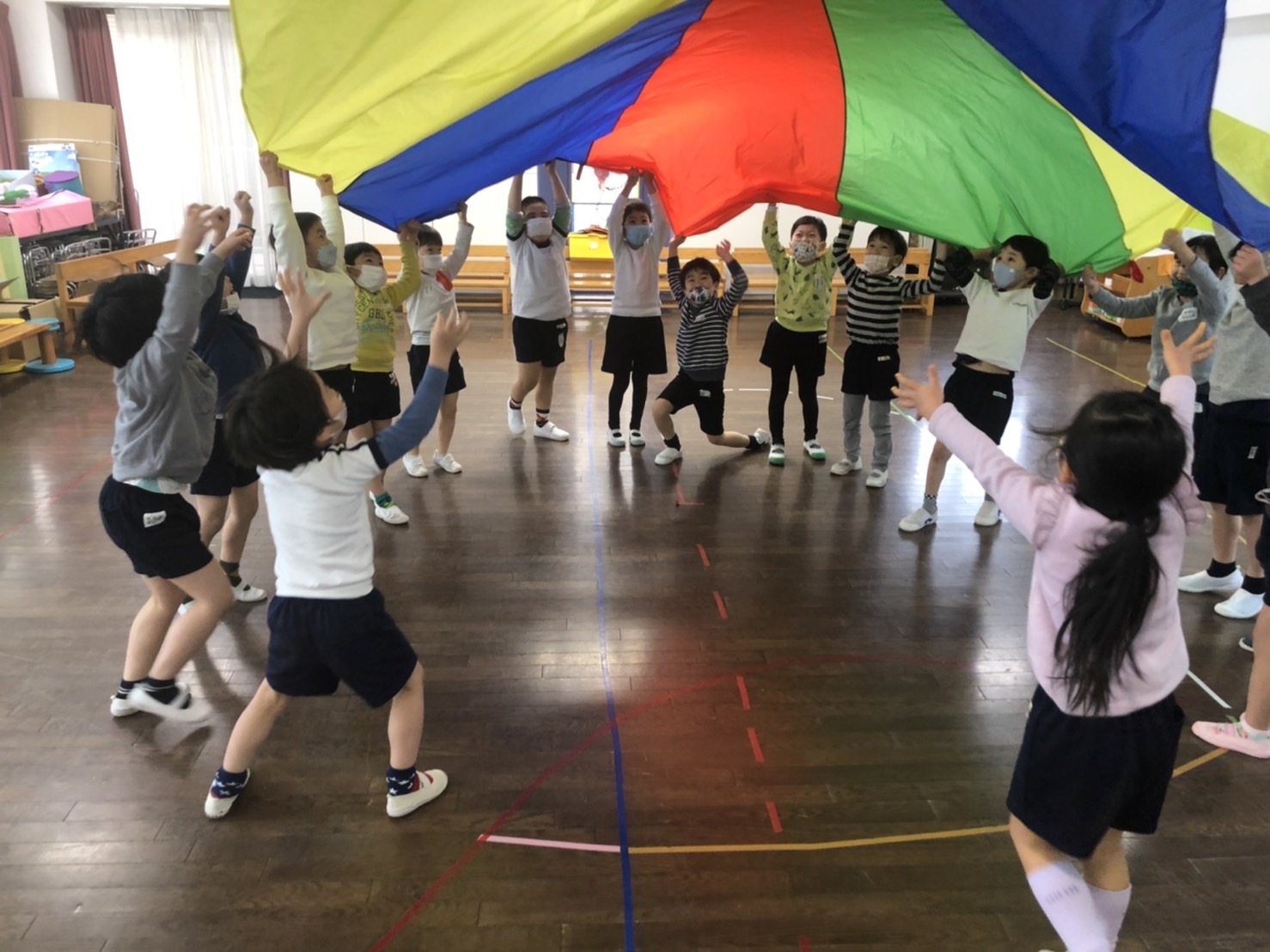 体操は賀子先生のコオーディネーショントレーニングでした。「ぼく、賀子先生のコオーディネーション大好き!」と楽しみにしていました。パラバルーンをつかって、ボールの片付けは、おなかにたくさんボールを入れて集めてくれました。