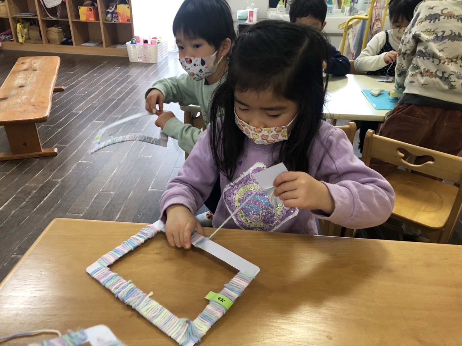 今日はそのフレームを、毛糸を巻いて作りました。根気の要る作業ですが、とてもよく頑張っています!