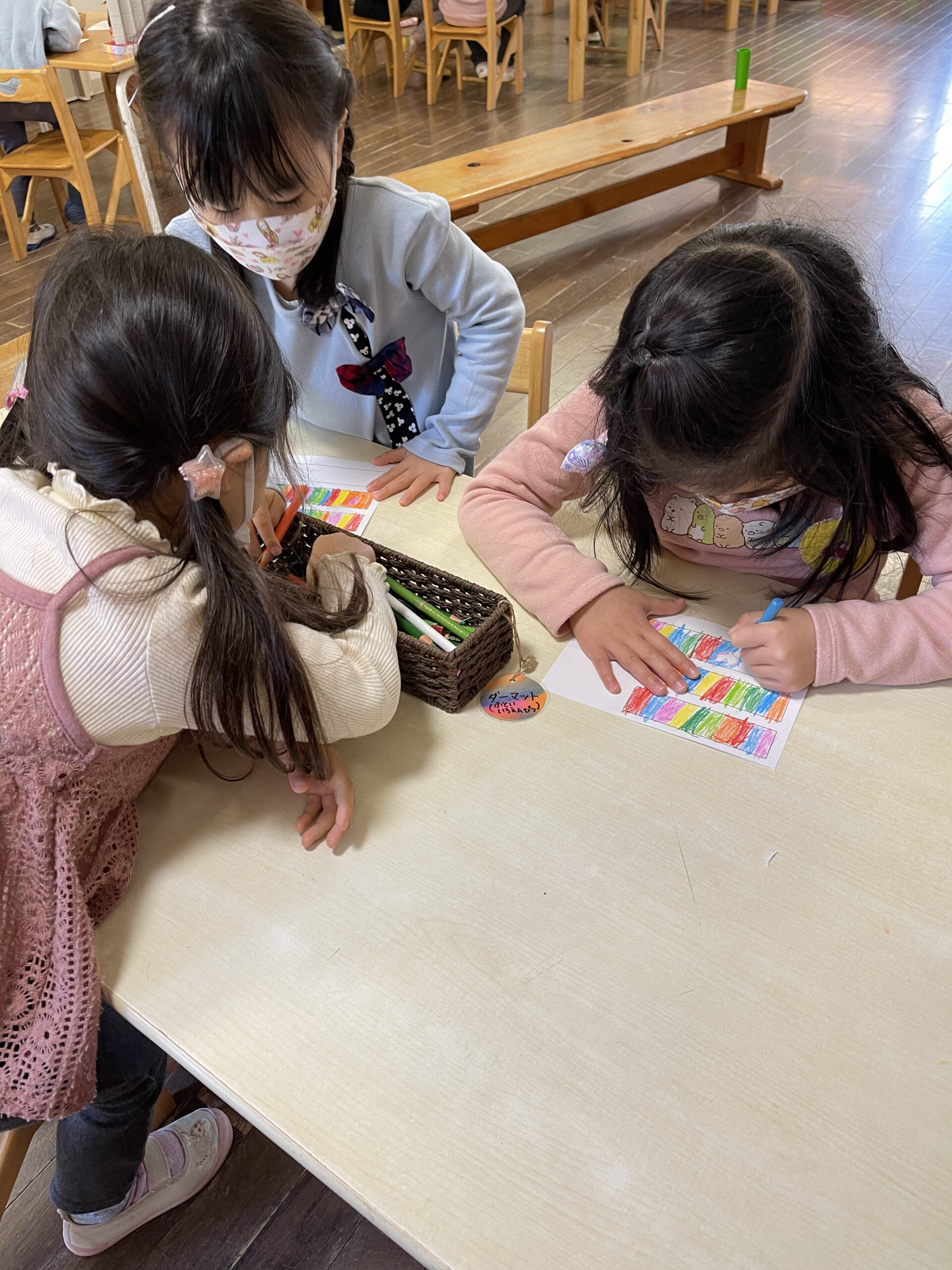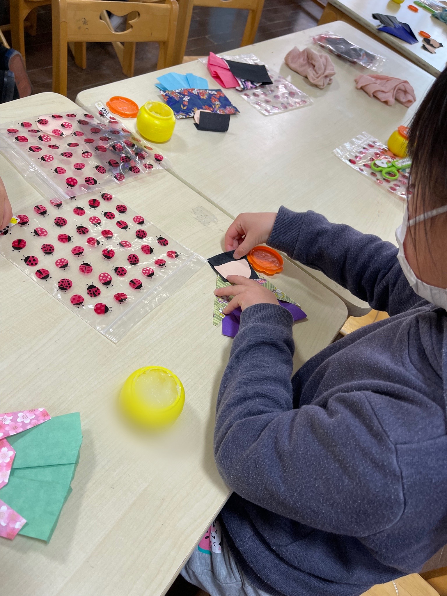 各クラスでは、紙粘土や紙皿、千代紙、ヤクルトの空き容器などを使って、ステキなお雛様を作り始めました。