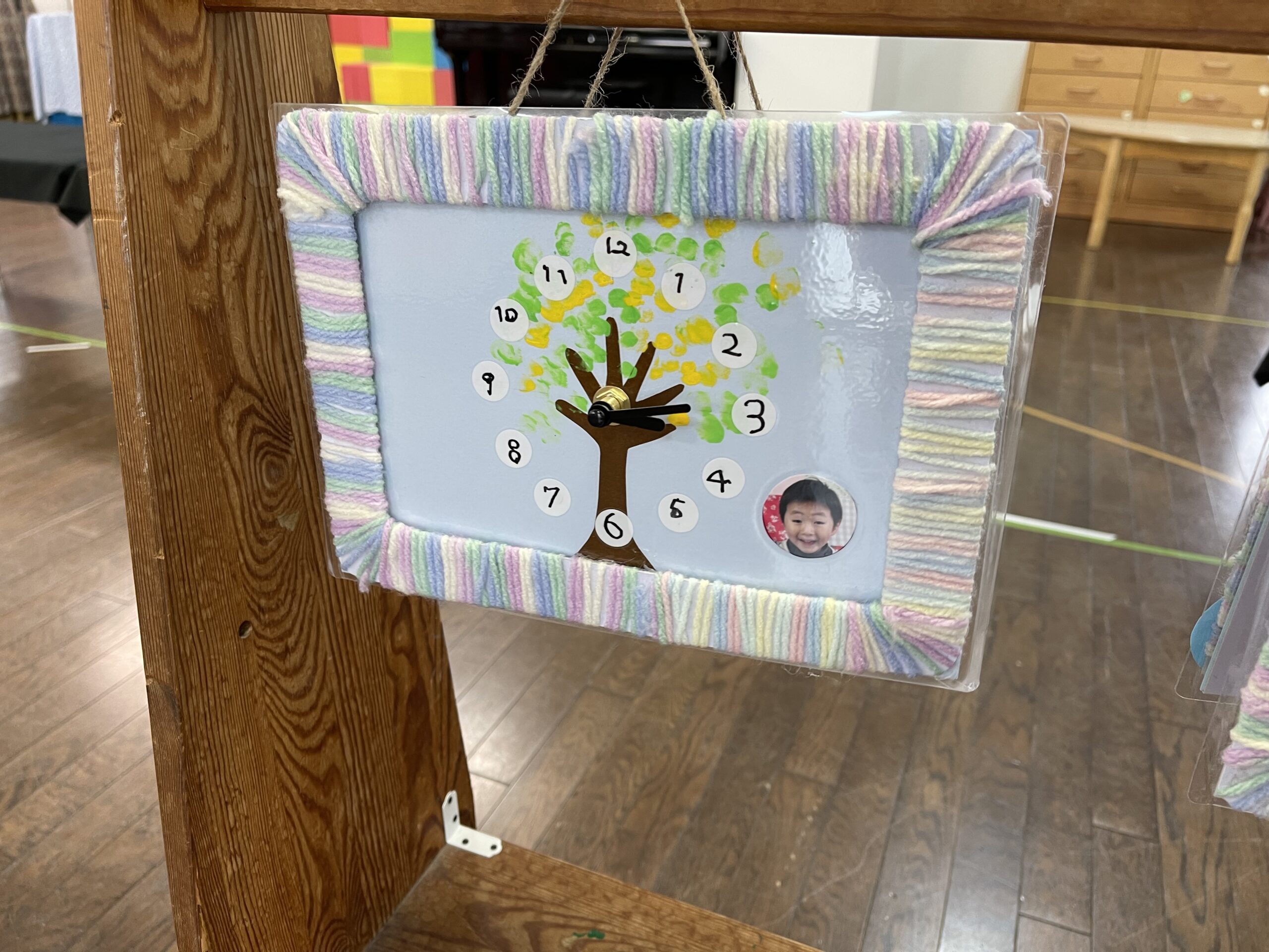 年中組は、時計です。年長組になったら…自分で時計を見て、今自分がどうしたらよいのか??考えていくことも、増えるでしょう!小さな指で木の葉を飾っています。来年は…どのくらい大きくなっているのかな?楽しみですね。