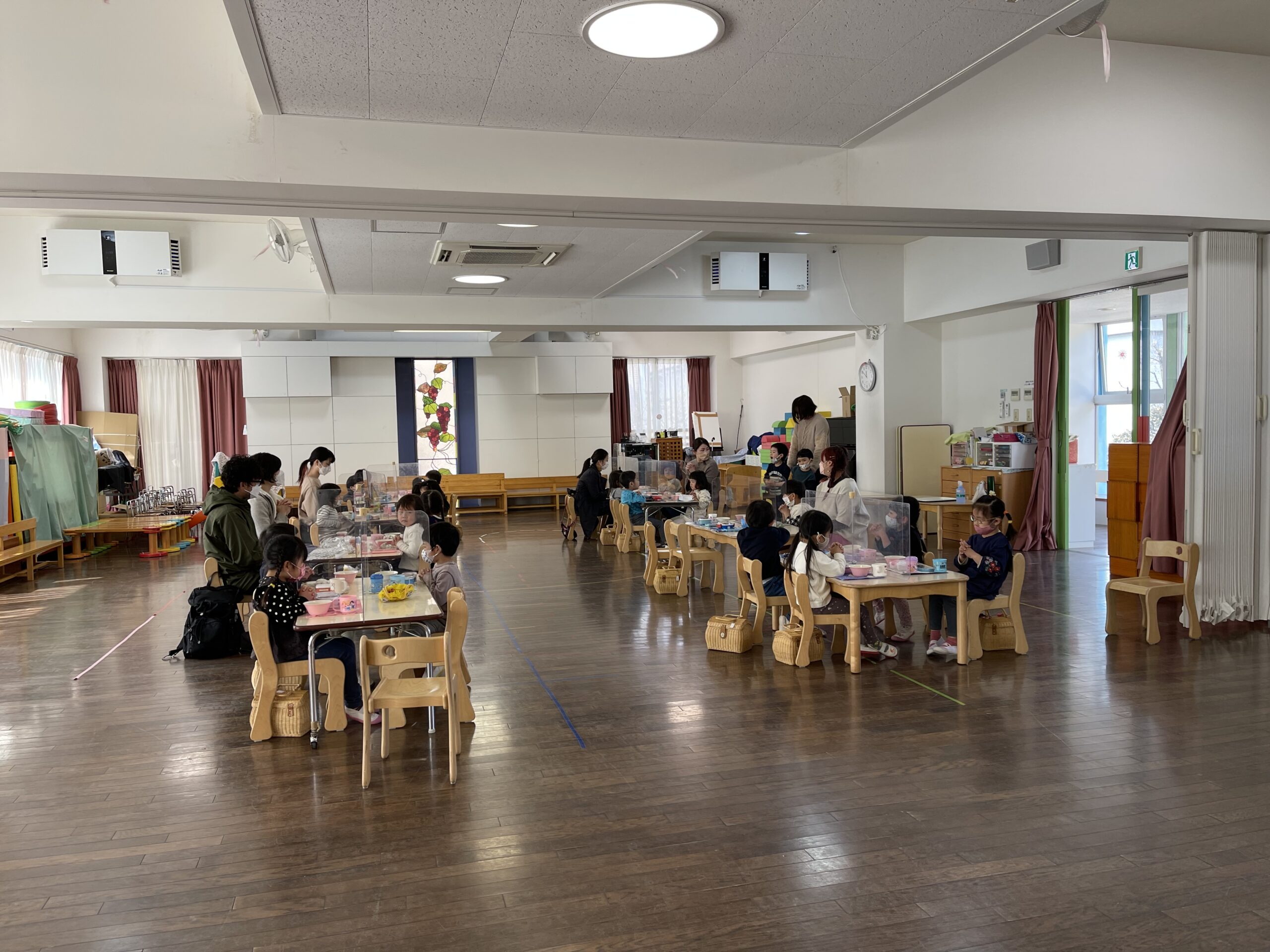 年少組は…広いホールでおにぎりの日をおうちの方々と…!