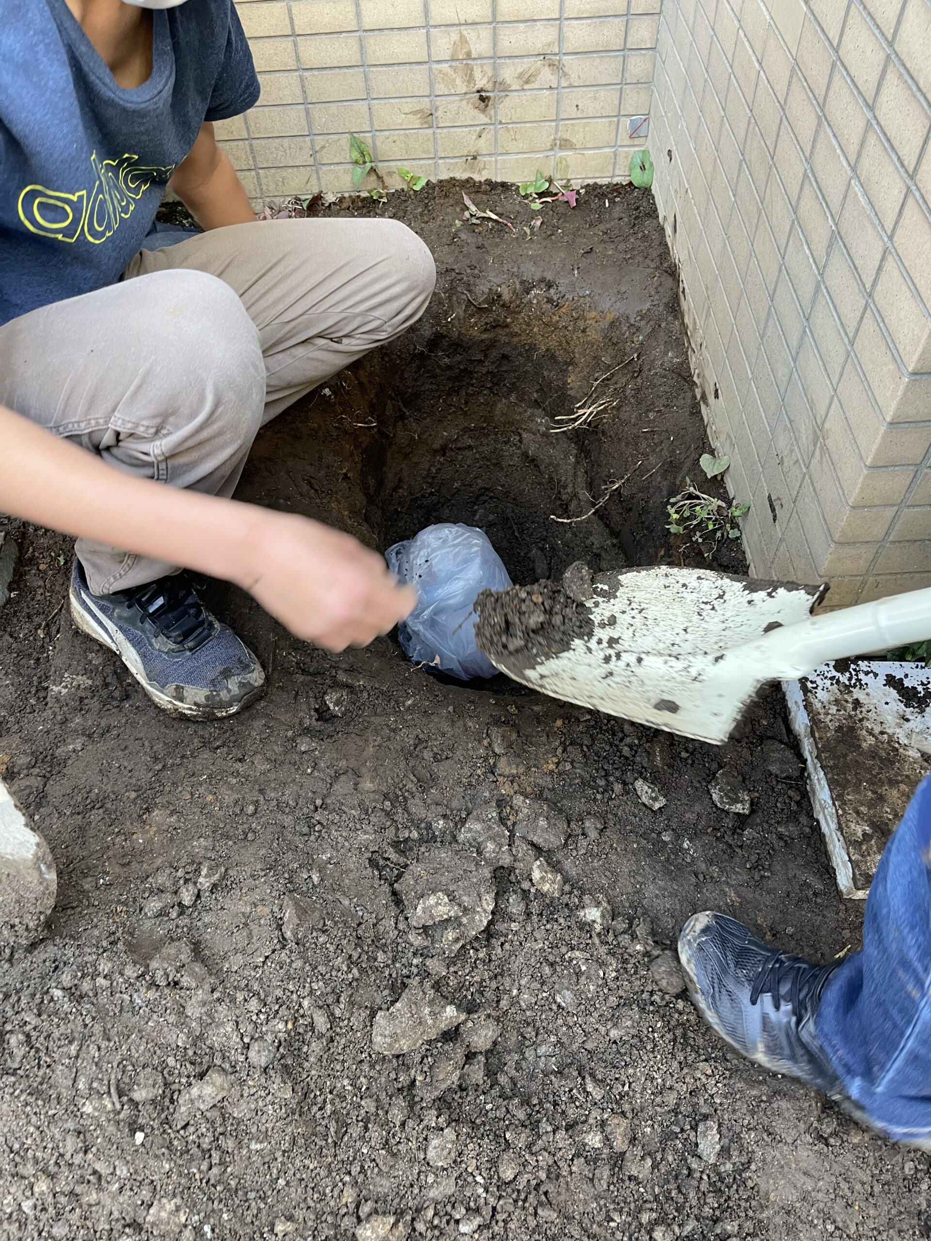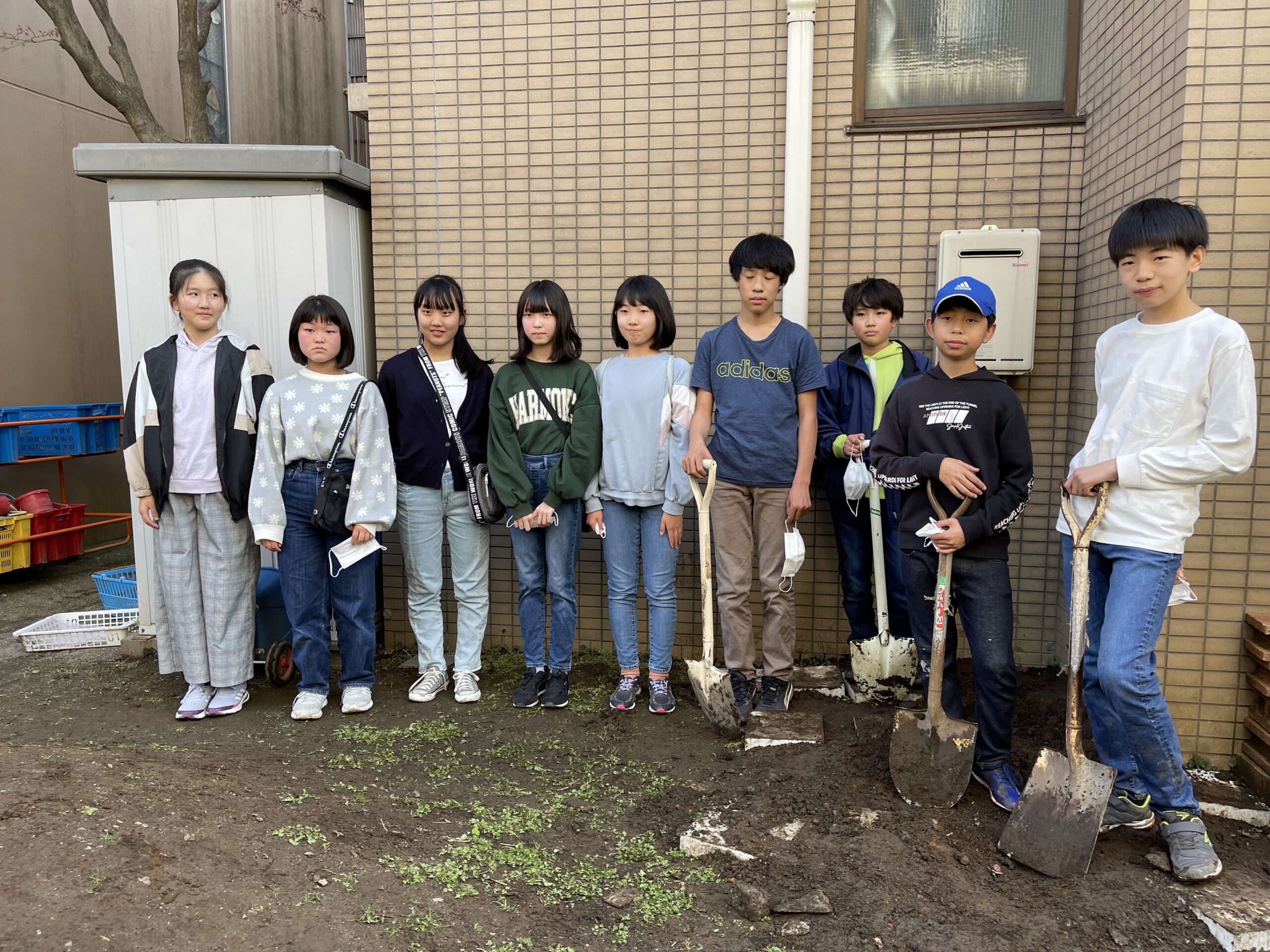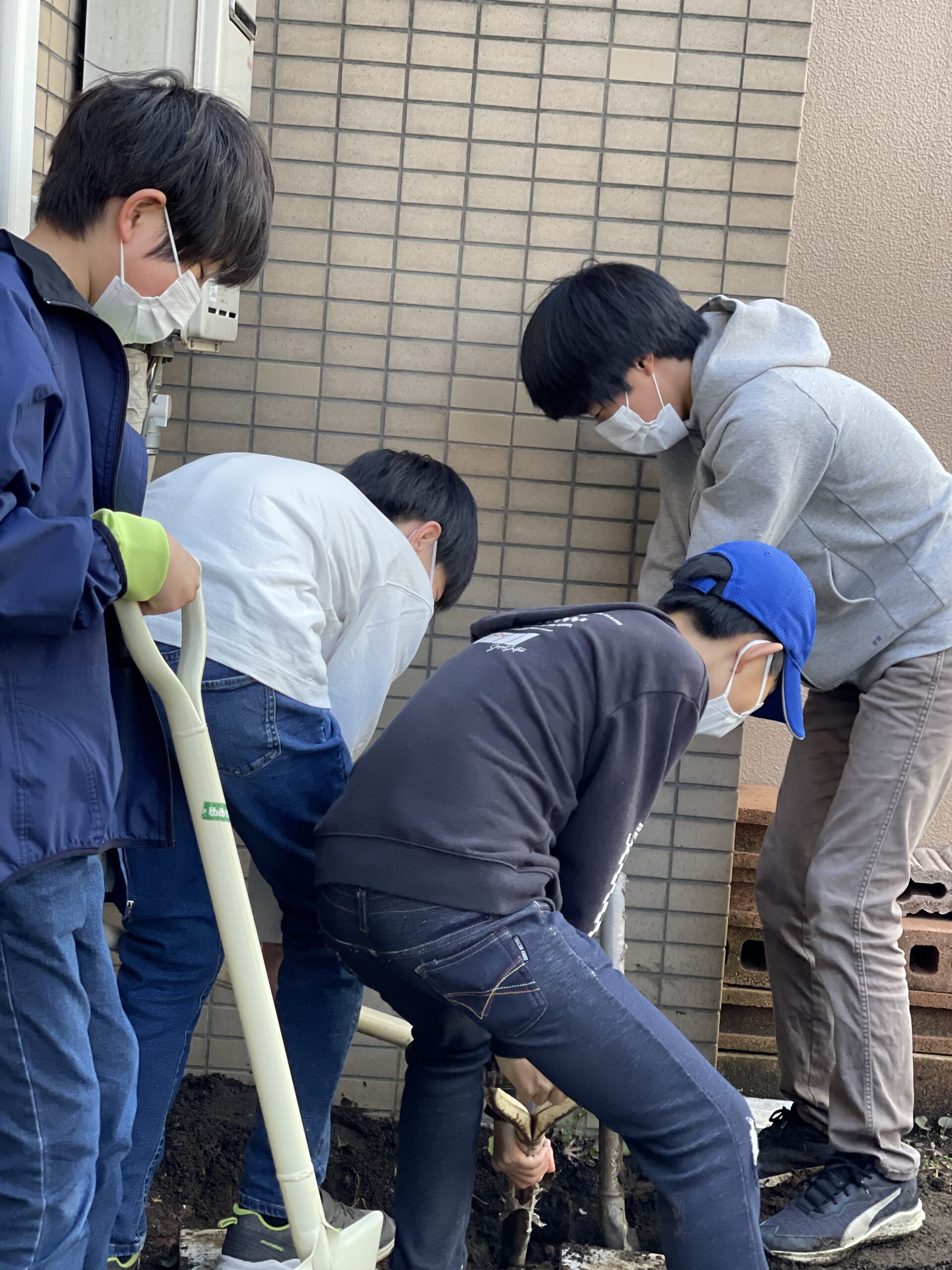 中学1年生は、タイムカプセルを埋めにやってきました。穴を掘るのは男子!女子は、ひたらすら見守ります。あちらこちらを汚しながらも目的を目指して必死に取り組んでいましたね。たのもしかったですよ。