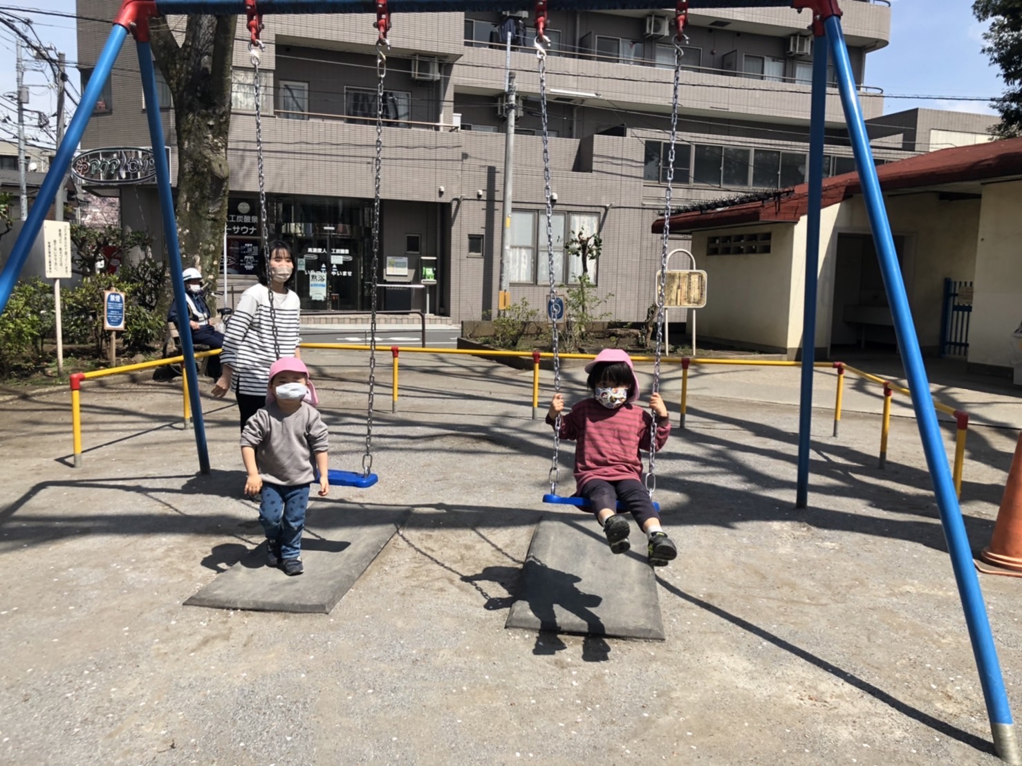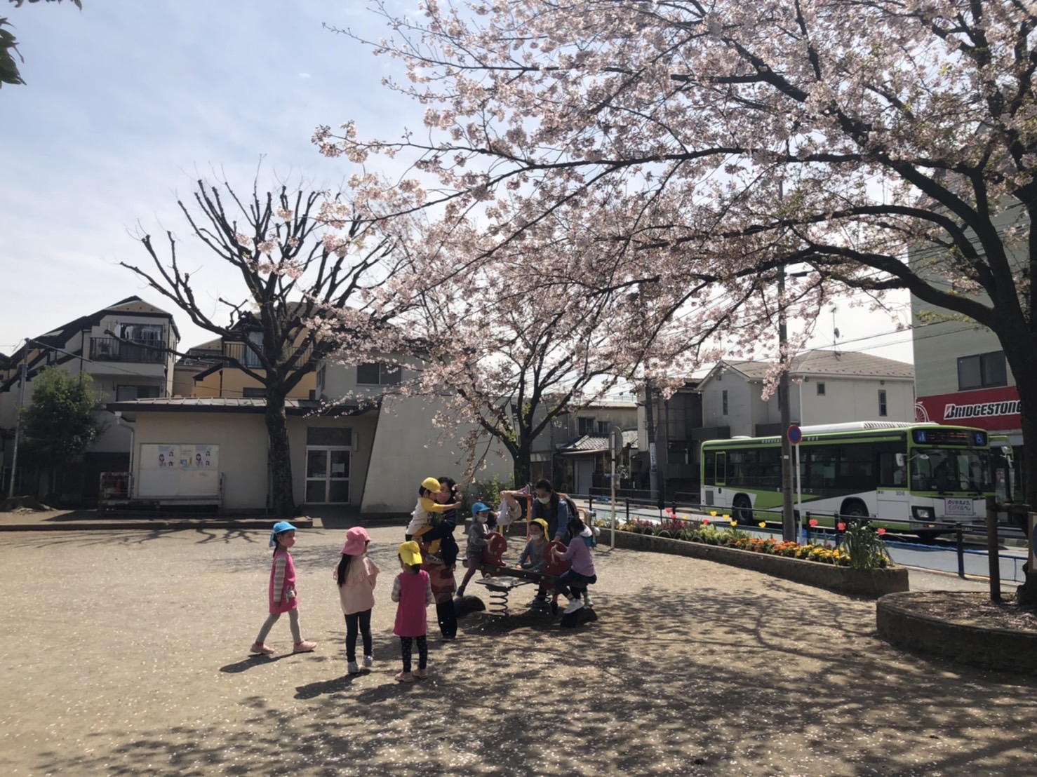 預かり保育の子どもたちは、水久保公園に遊びに行きました。桜吹雪が舞う中、保育園のお友だちとも遊具で遊びましたね。