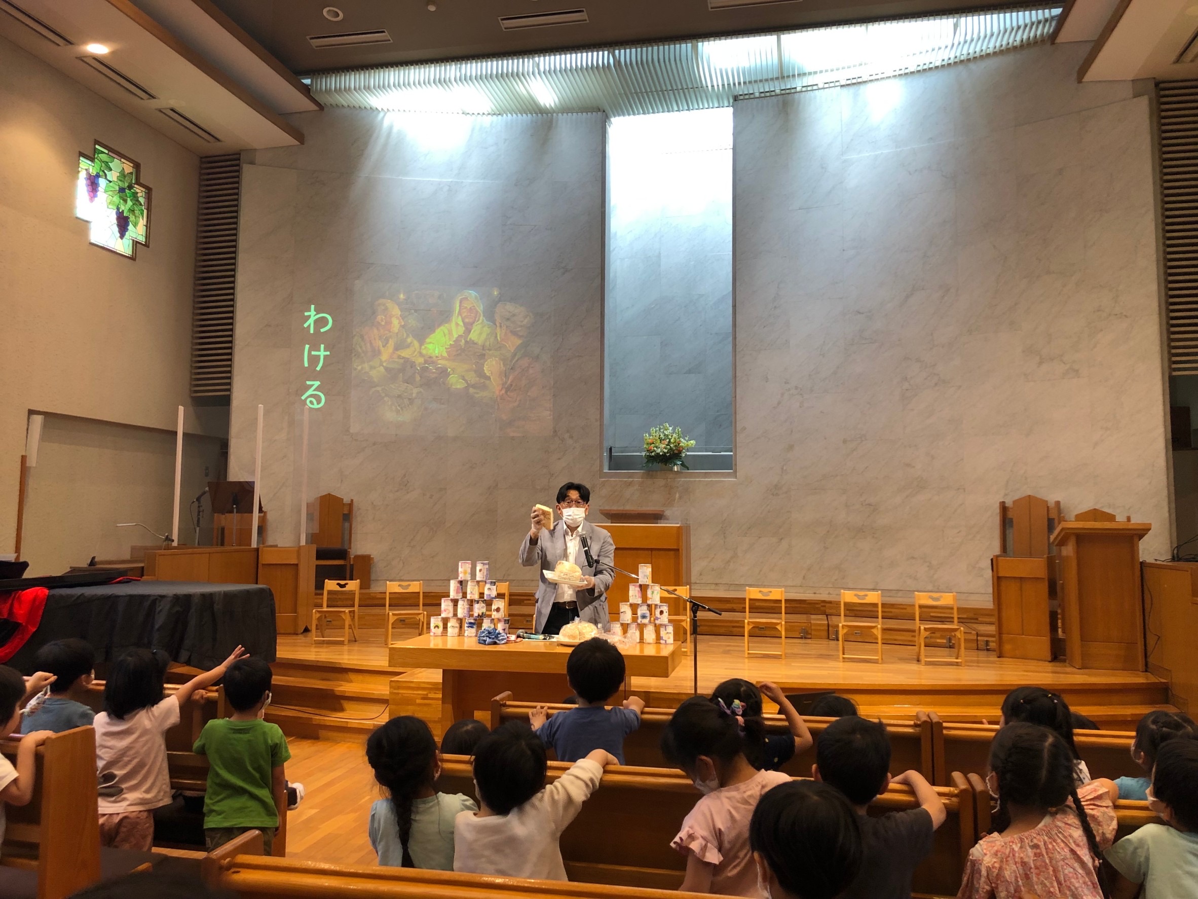 今日はお誕生日会がありました。礼拝では、園長先生は大きなパンを、3クラスに分けてくれました。クラスで更に分け合い、分け与える恵みに感謝して、いただきました。このような経験が、子どもたちの心に残ってほしいと願っています。