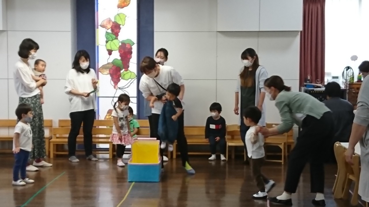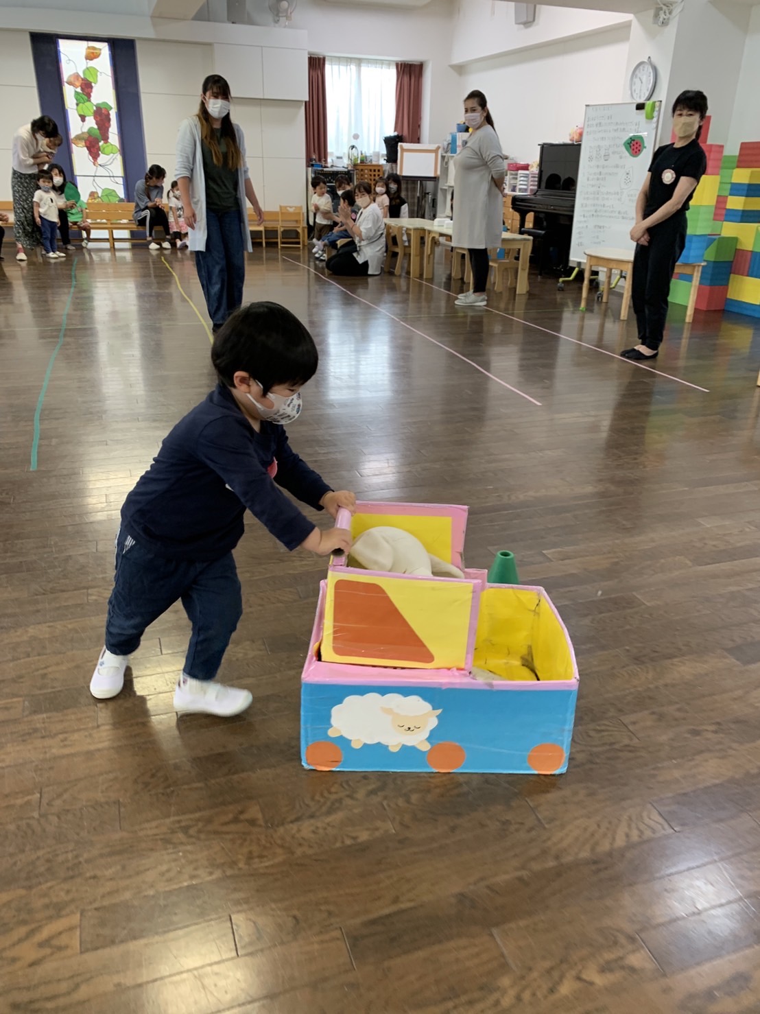 段ボールのカゴに乗って、おうちの方に押してもらおう!とお話しましたが、「自分で押してみたい!」お友だちはぬいぐるみを乗せて、ぴゅーんとあっという間に帰ってきましたね!