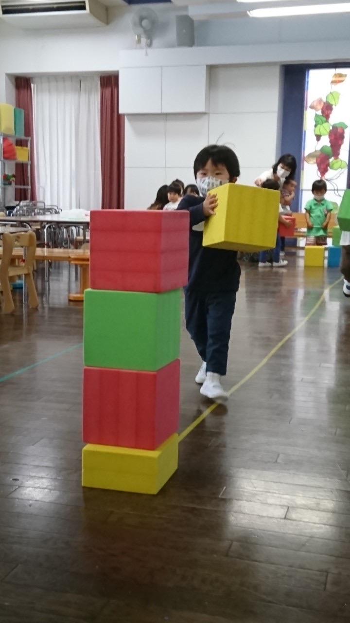 次はブロック運び。ブロックを運んでゴールのブロックに積んでいきました。