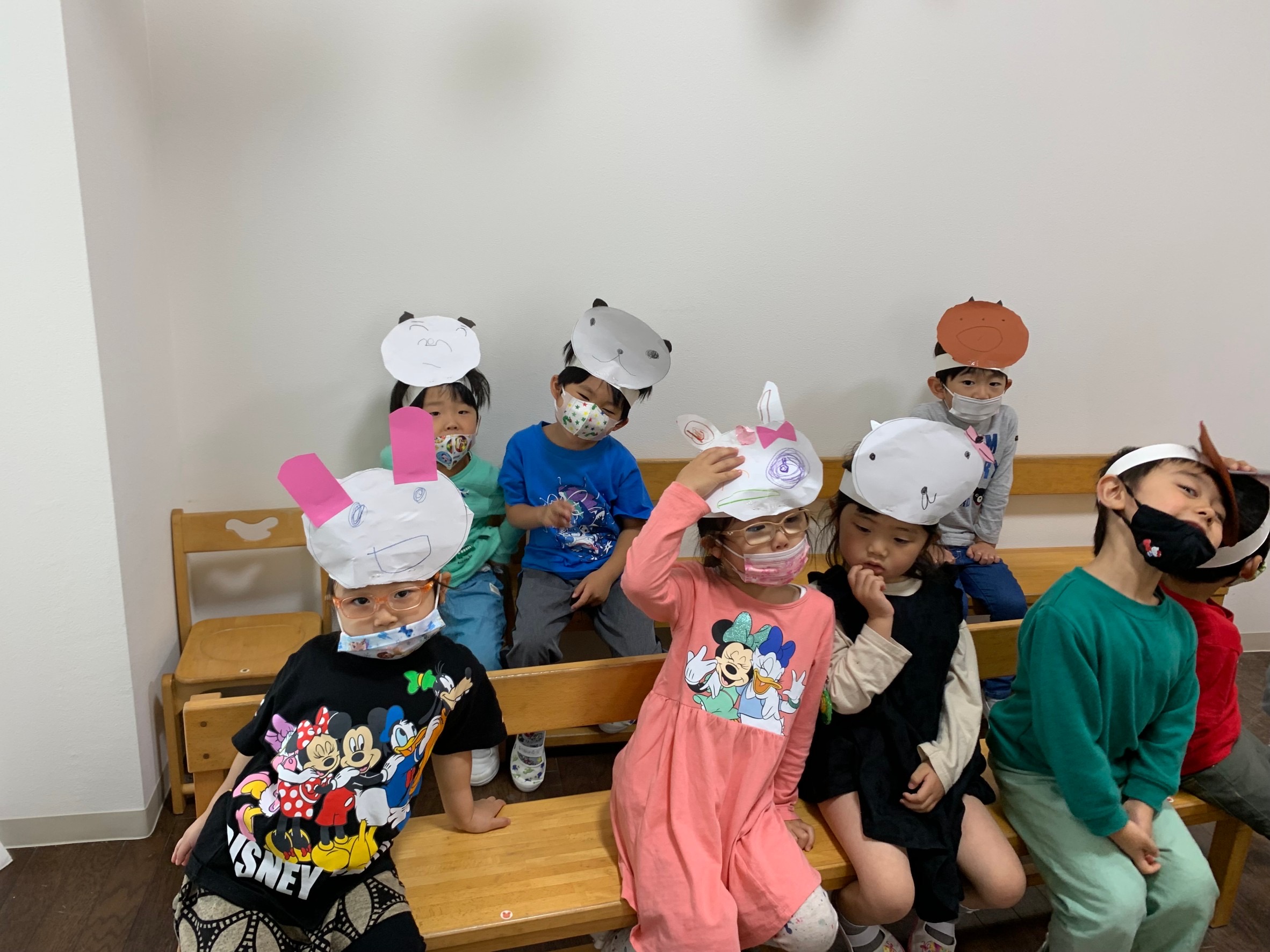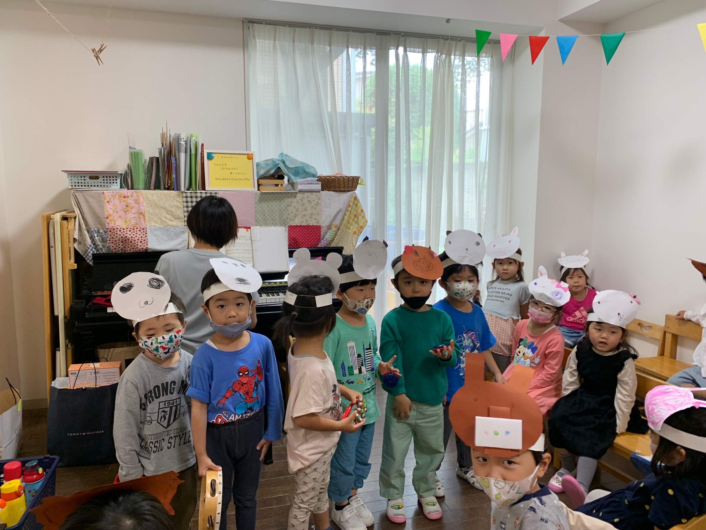 先週はみんなでお面を作って、「山のワルツ」を演奏しました。かわいいどうぶつさんがリズムに合わせて楽器を演奏しながら歌いました。