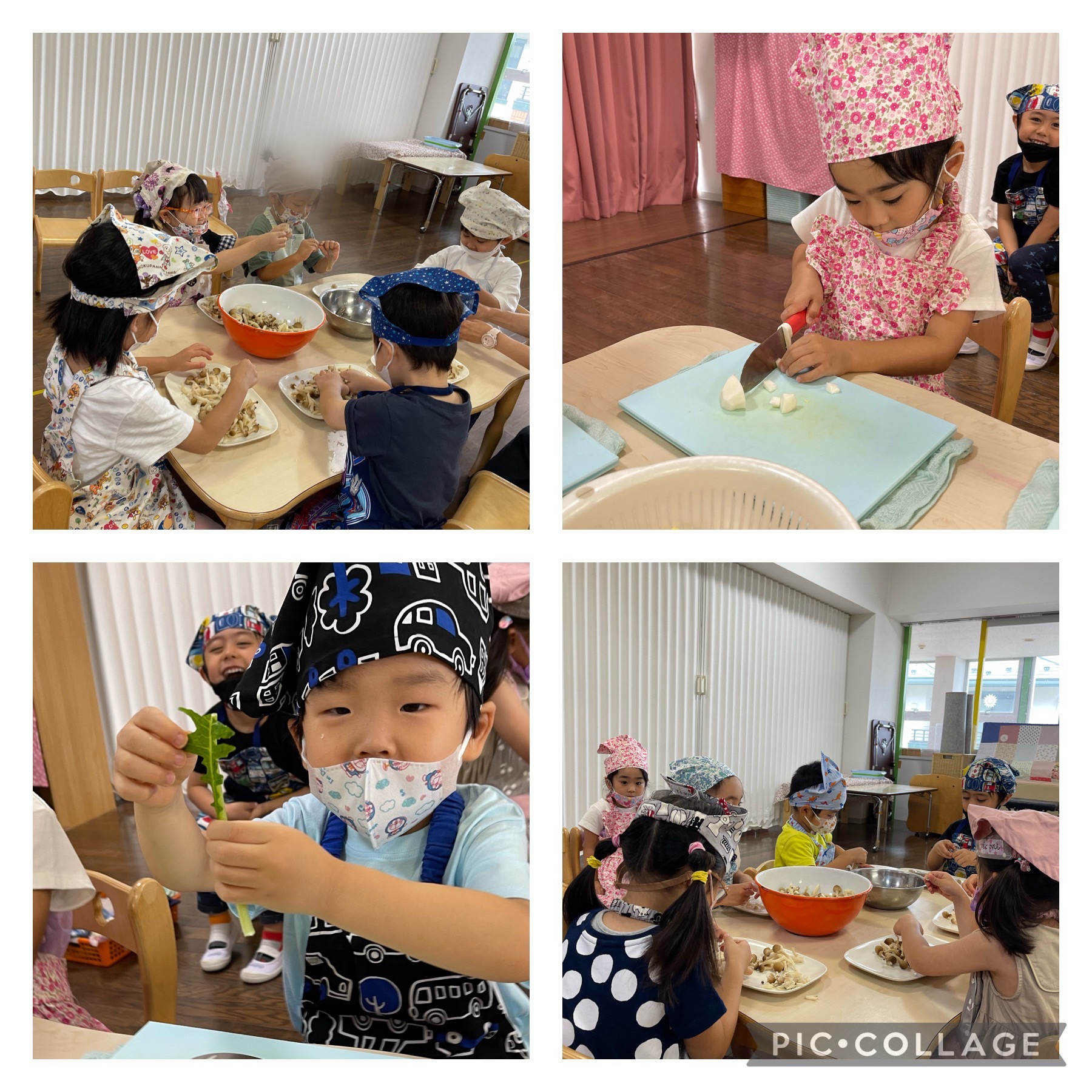今日は、たんぽぽ組のお友だちがお野菜などを切ってくれました。『かぶ・かぶの葉っぱ,こんにゃく・玉ねぎ・しめじ・にんじん・あつあげ』包丁な使い方も上手になりましたね!