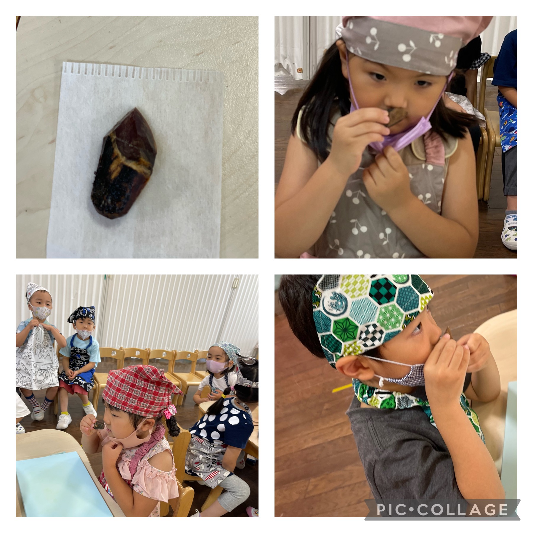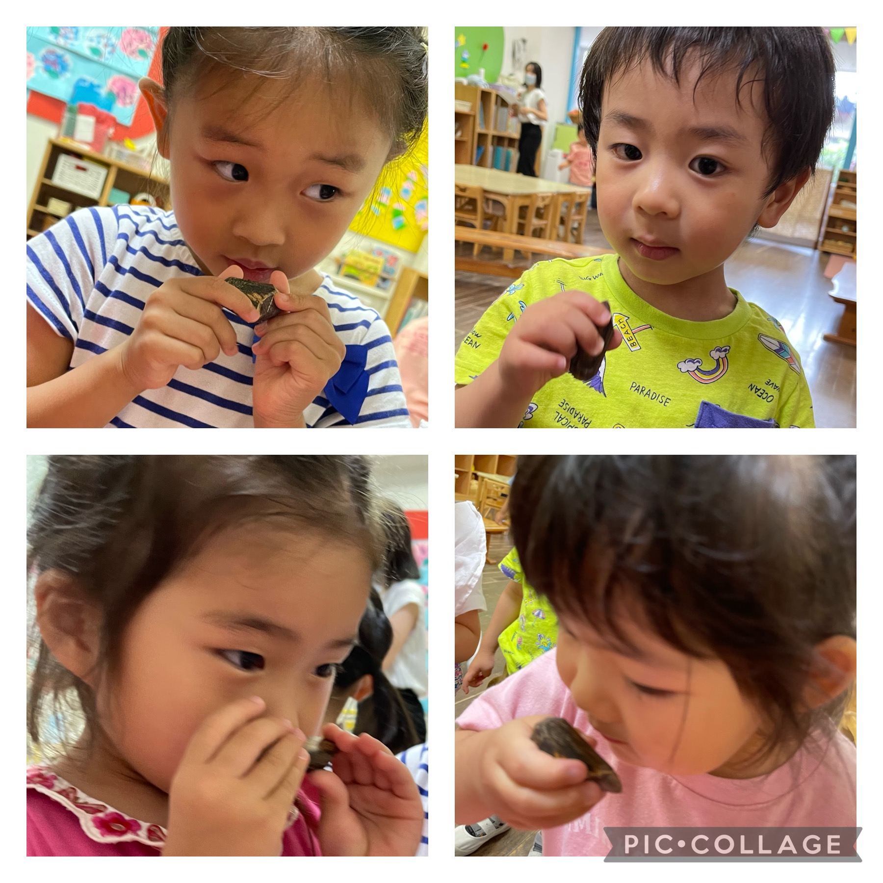子どもたちに『何だと思う?』『いしー。』皆で、くんくん匂いを嗅ぎ。『いいにおいはする』『しゃけのにおいかな?』答えは出ませんでした。