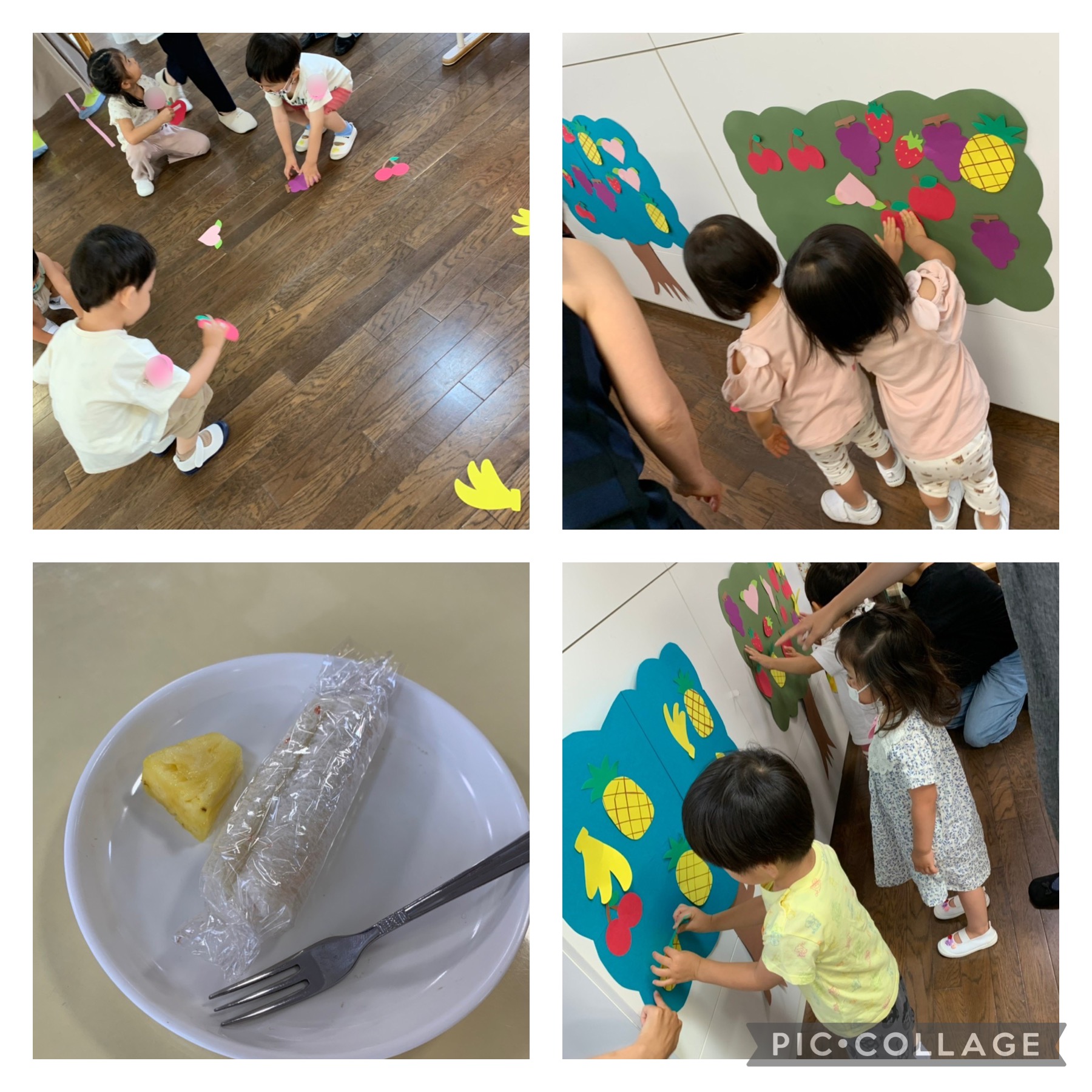 ホールのあちこちに、りんごやもも、ぶどうにバナナ、パイナップルとさくらんぼにいちごが落ちていて、おうちの方と一緒に見つけて木に貼りました。