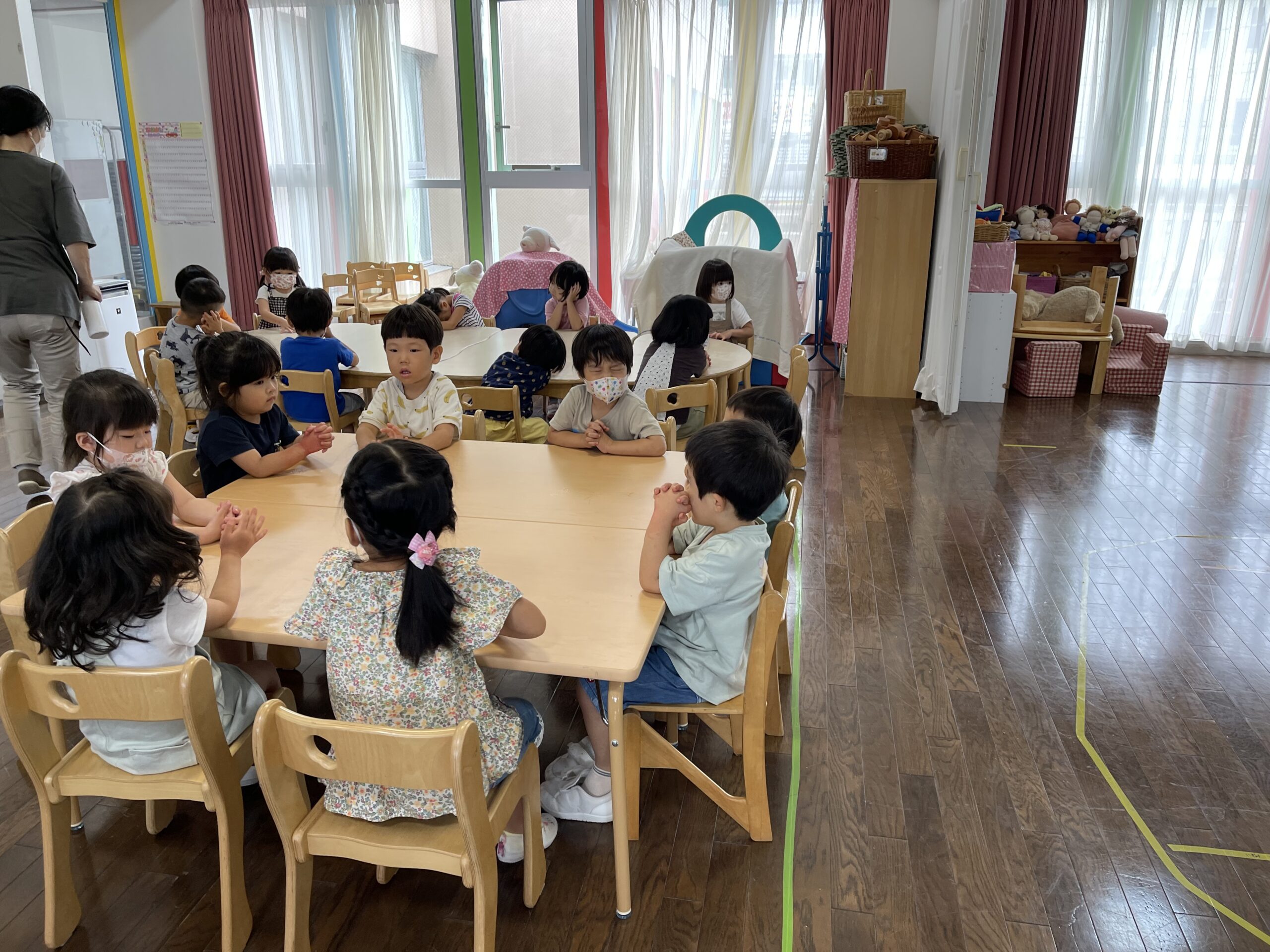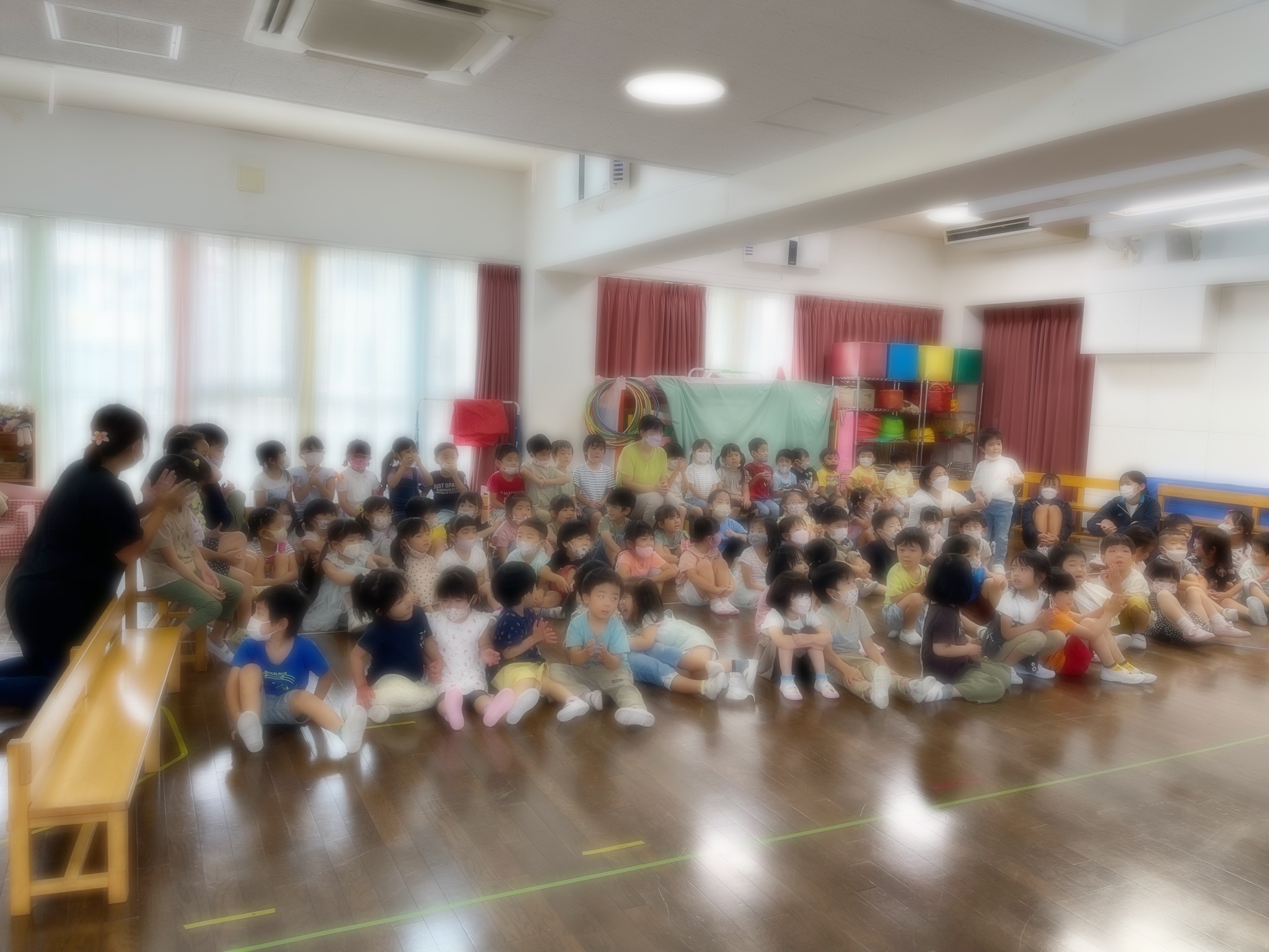 一年で、一番お月さまの綺麗な十五夜。歌を歌ったり・先生たちの『お月さまにうさぎがいるのはなぜ??』のペープサートも観ましたね。