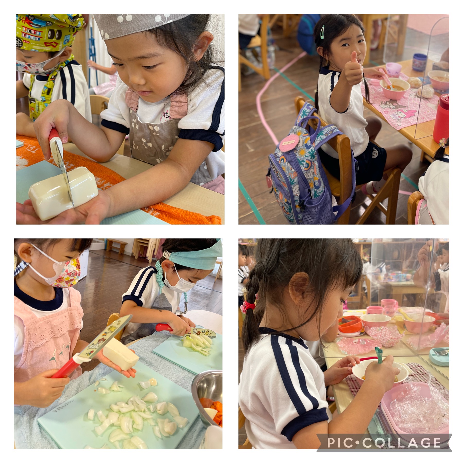 今日の年中たんぽぽ組は、お味噌汁の具材を切りました。にんじん、玉ねぎ、お豆腐。包丁の持ち方も慣れてきました。お豆腐は手のひらに乗せて、手の上で切りました。手の上に乗せたことで、気をつけて切っていました。