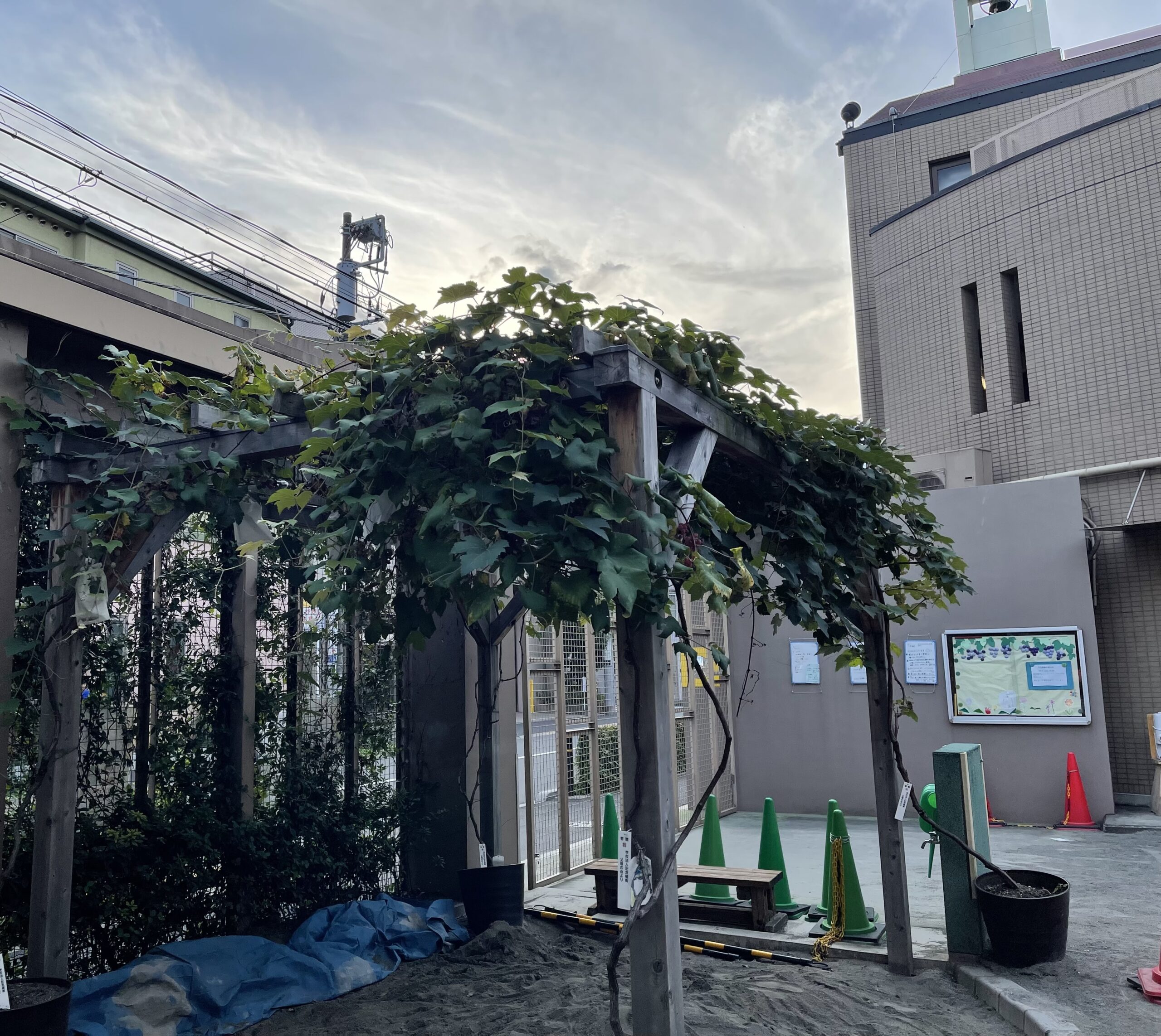 幼稚園のぶどうの木は、枝がしっかりと棚を覆い、砂場で遊ぶ子どもたちを日差しから守り、今年もたくさんのぶどうを皆で収穫し、いただくことも出来ました。年々甘さが増し、子どもたちは大喜びで頬張っていました!