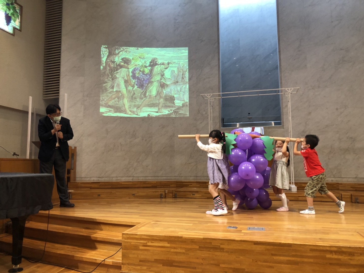 教会では園長先生が、今月の聖句「わたしはぶどうの木 あなたがたはその枝である」(ヨハネ15:5)のお話をしてくれました。大きなぶどうがあるんですね、驚きましたね。