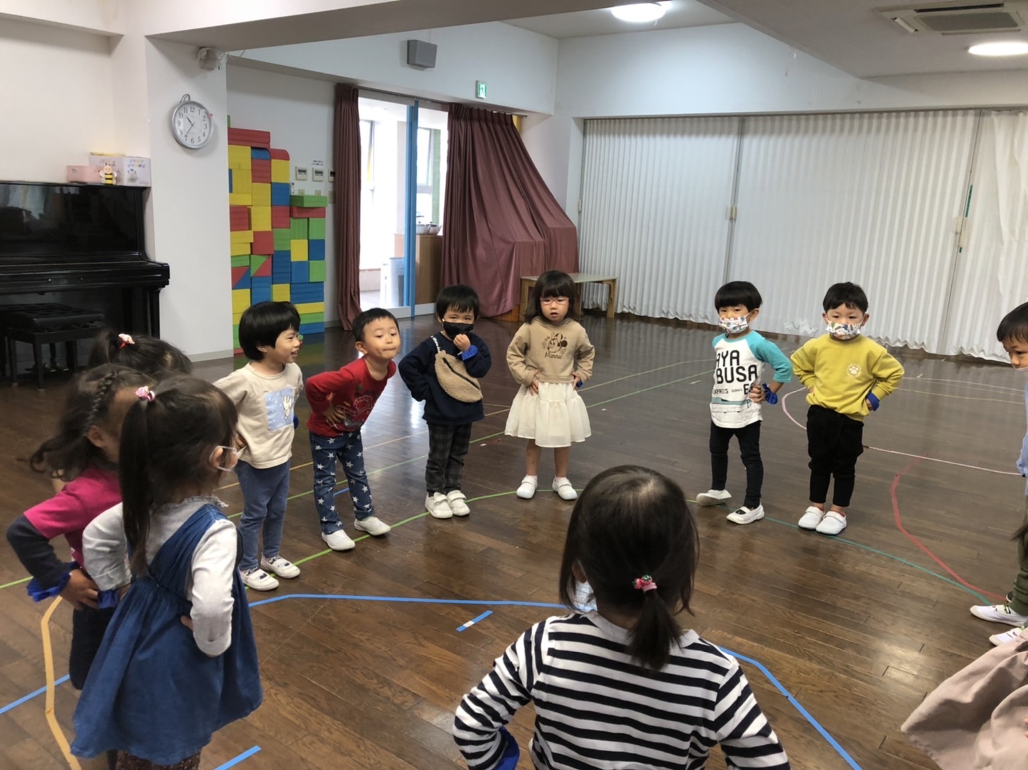 「最初の手は腰!」とお友だちと話しながら、おうちの方に見ていただくのを楽しみに頑張っていました。