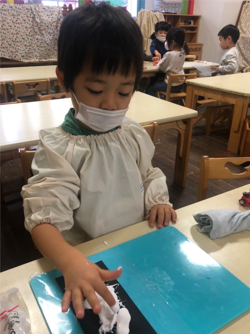 まずは、指でボンドをのばし、乾いたらペンで色を塗ります。