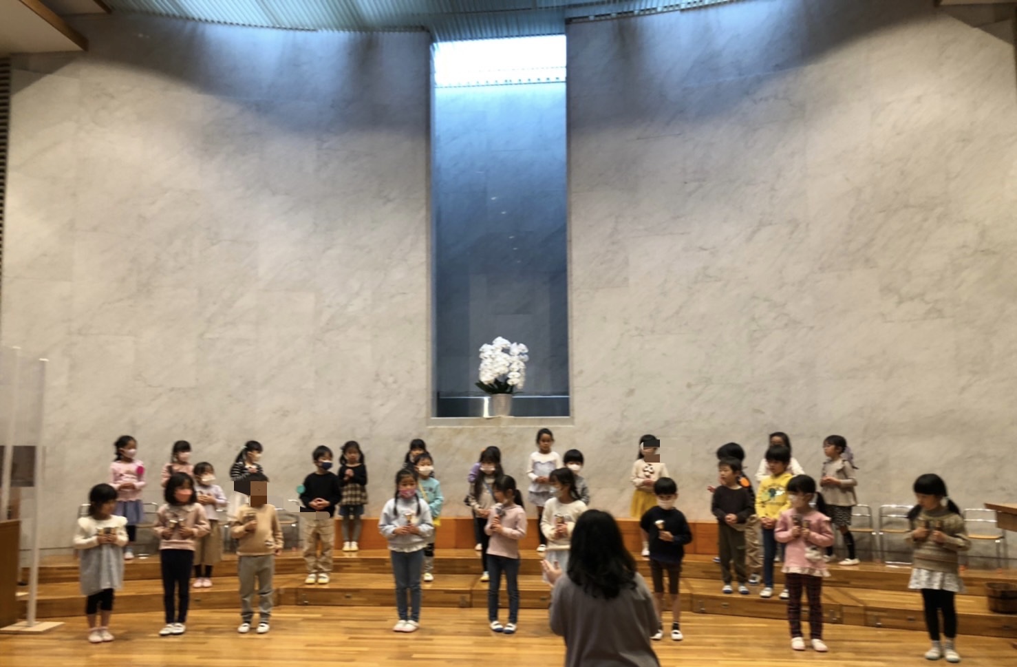 さくら組はサッカー教室に参加しました。ドリブルをしたり、シュートの練習をして、試合もしました。足だけでボールを蹴ることに気をつけたり、チームで勝つ為の作戦を計画したり、たくさんの経験を積み重ねた今の姿に成長を感じました。転んでも、手当てをすると、すぐにチームの中に戻っていました。限られた時間も大切に使えましたね。午後からはページェントの練習をしました。教会堂での練習が大好きなさくら組の子どもたち!数回の練習で「明日本番でいいよ!」と得意げにお話してます。