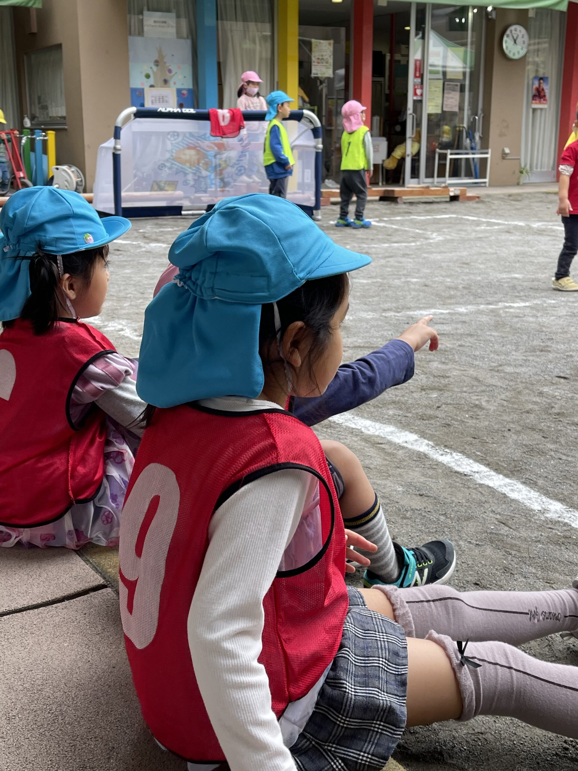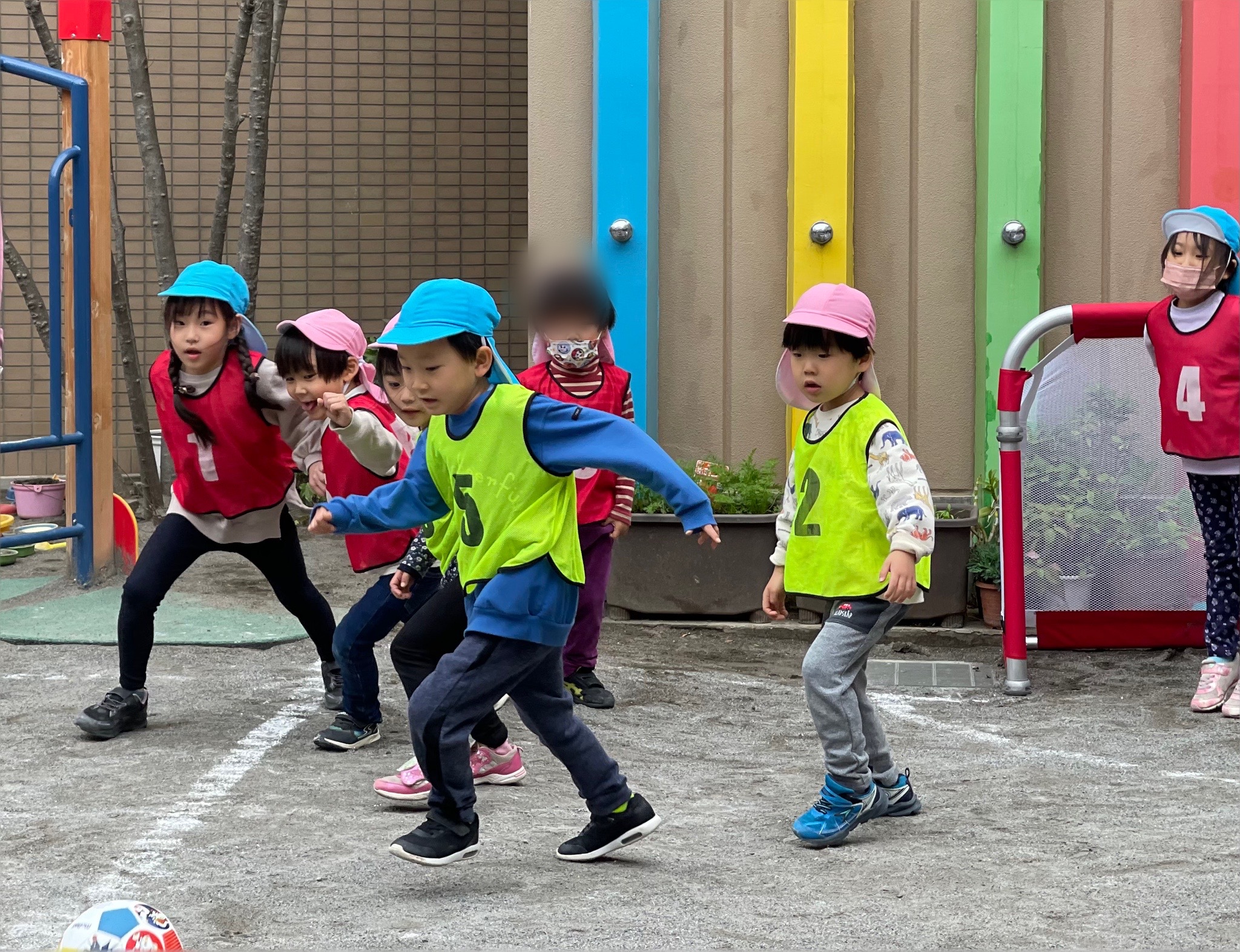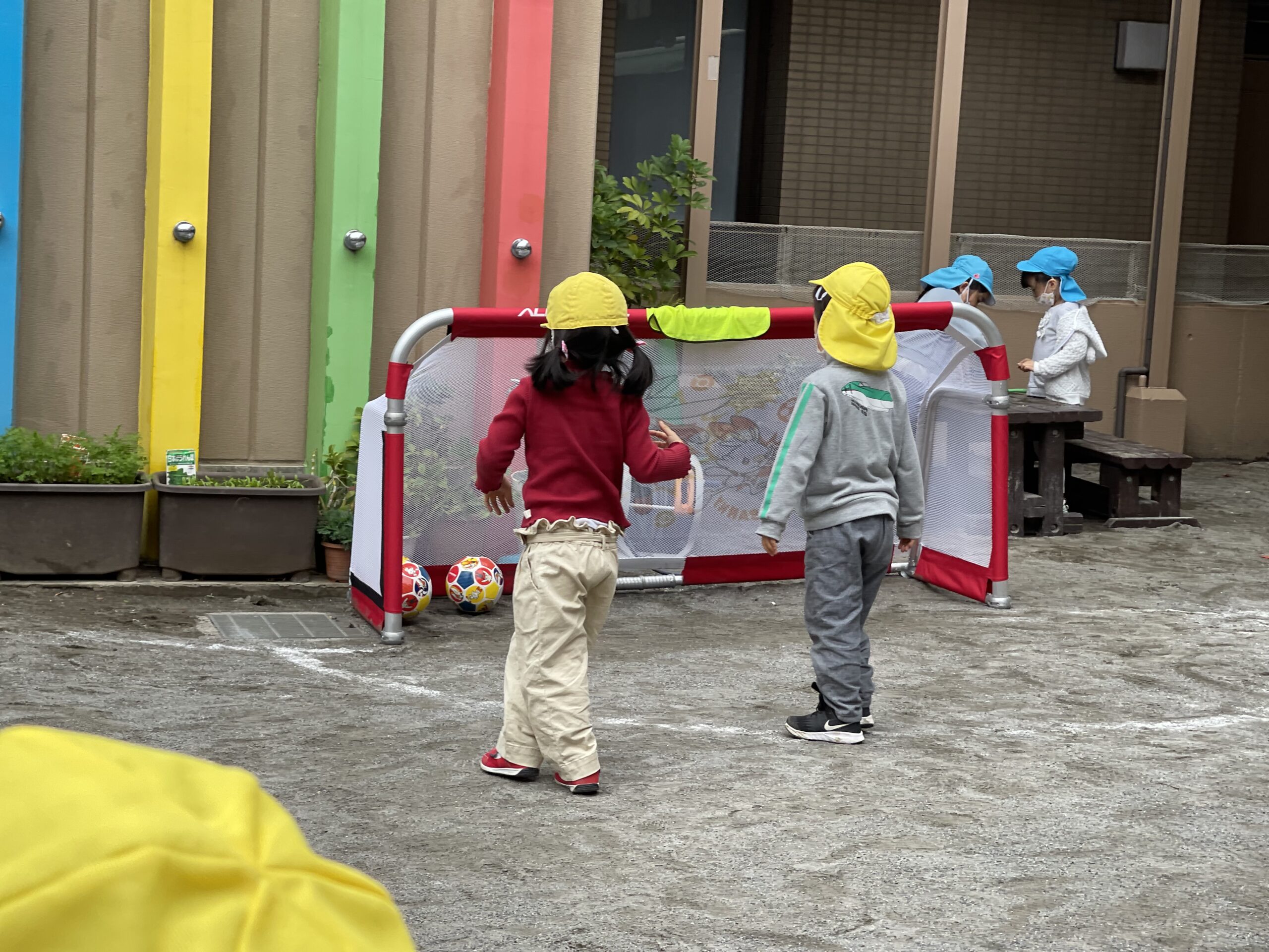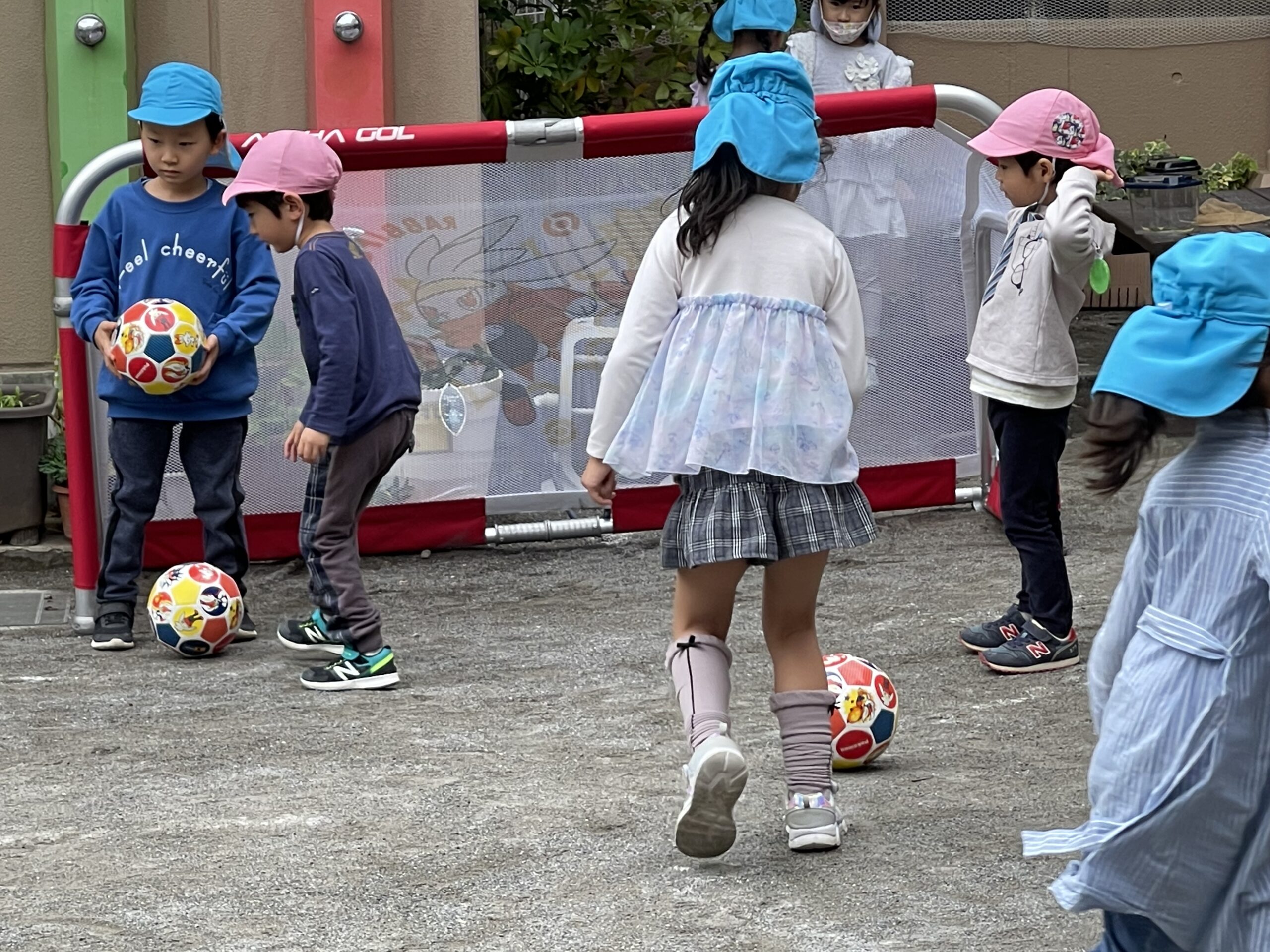 どの学年もサッカーゴールや新しいボールに興味を持ち遊び始め、年長組を中心にビブスを着て試合を始めました。その横で、年少組の子どもたちが、ボールを持って蹴ったり・投げたり…