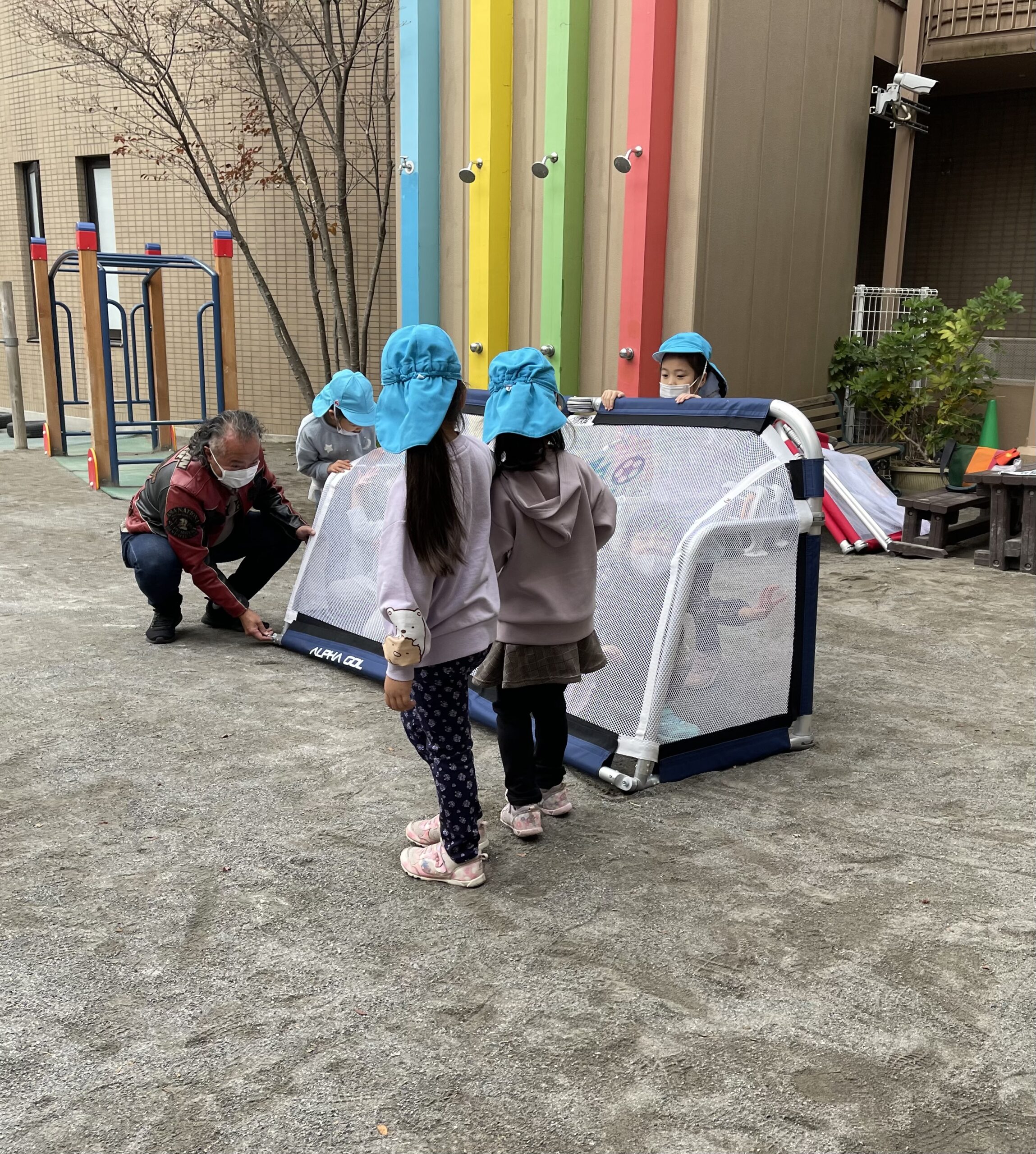 ワールドカップで、日本中がサッカーに関心を持つ今日この頃…。早速、ゴールを保護者の方に組み立ていただき、園庭に置くと…