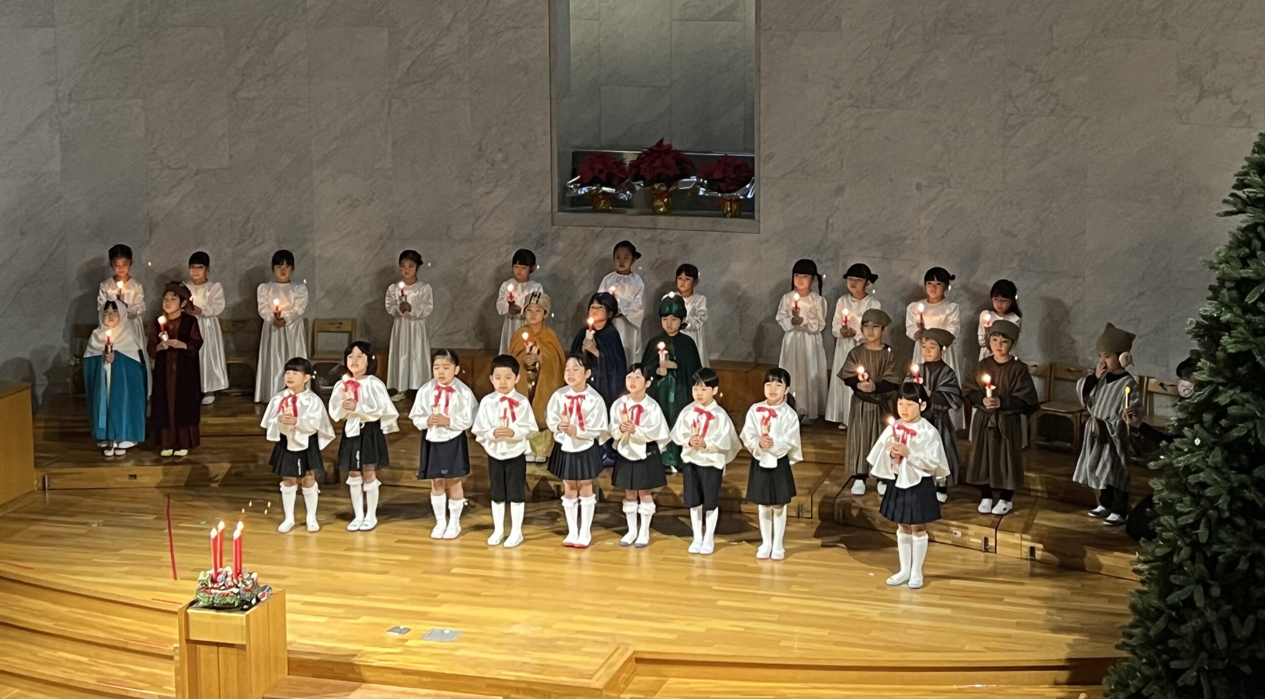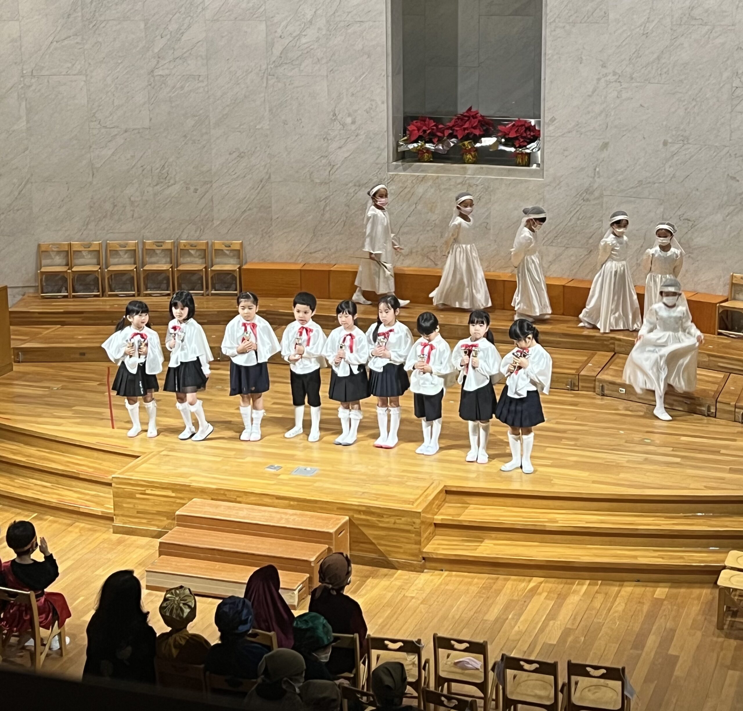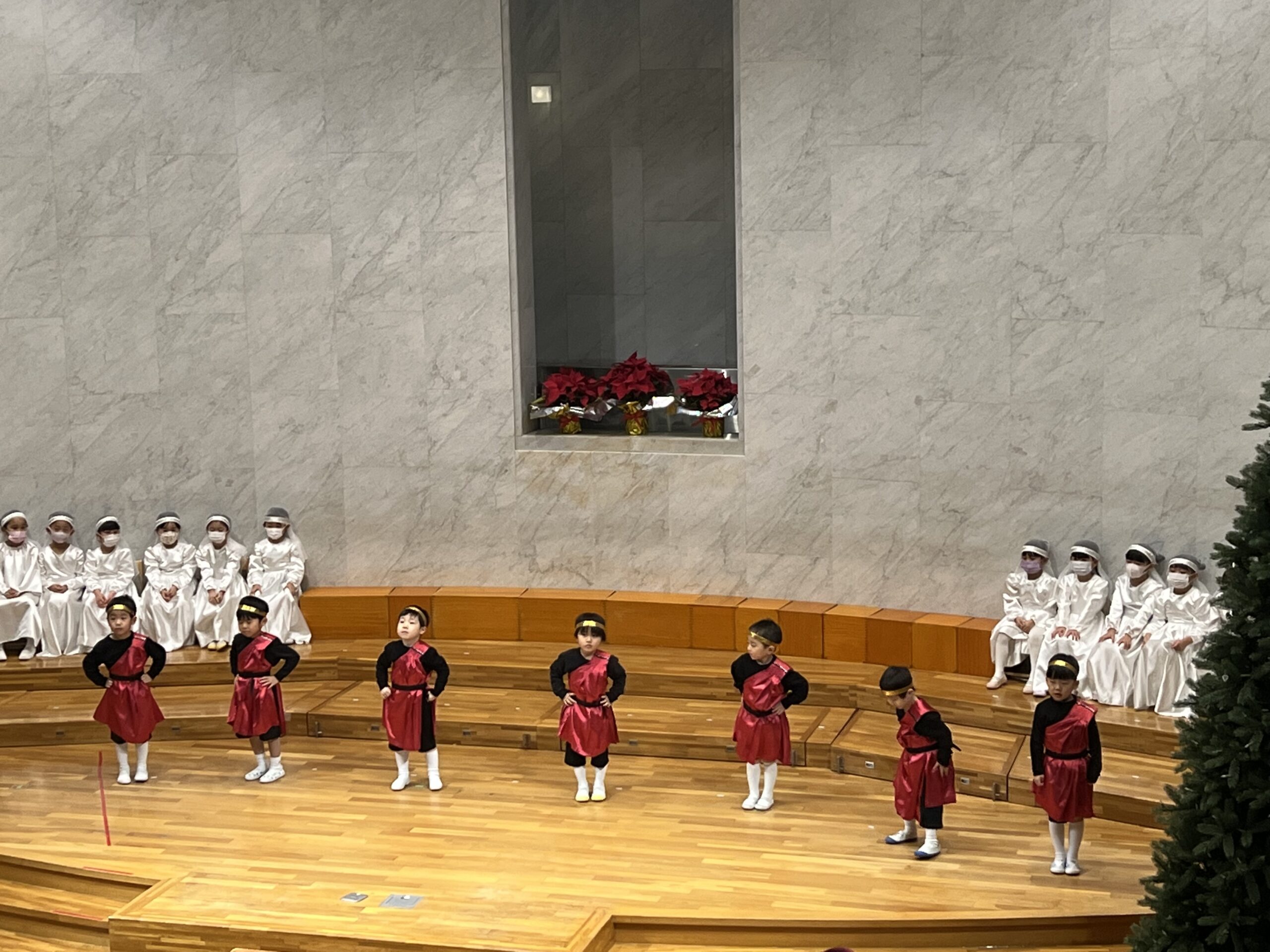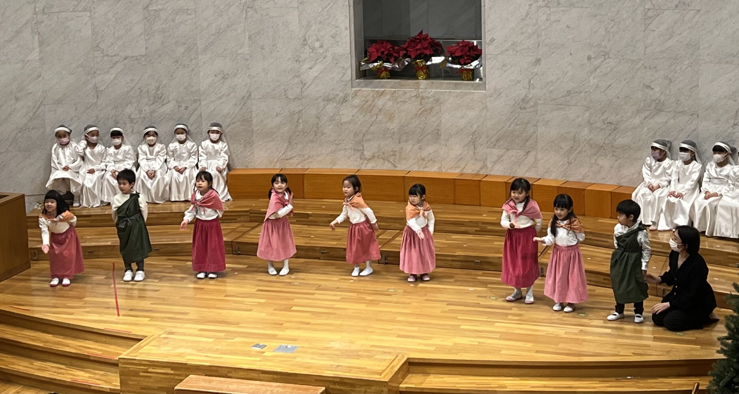 夕方の開催は…特別な気持ちにもなるようですね。始まった途端…良い緊張感を持った年長組一人ひとりの子どもたちが、持っている最大の力をページェントで表現していく姿が見られ、力強くとても素晴らしかったです。