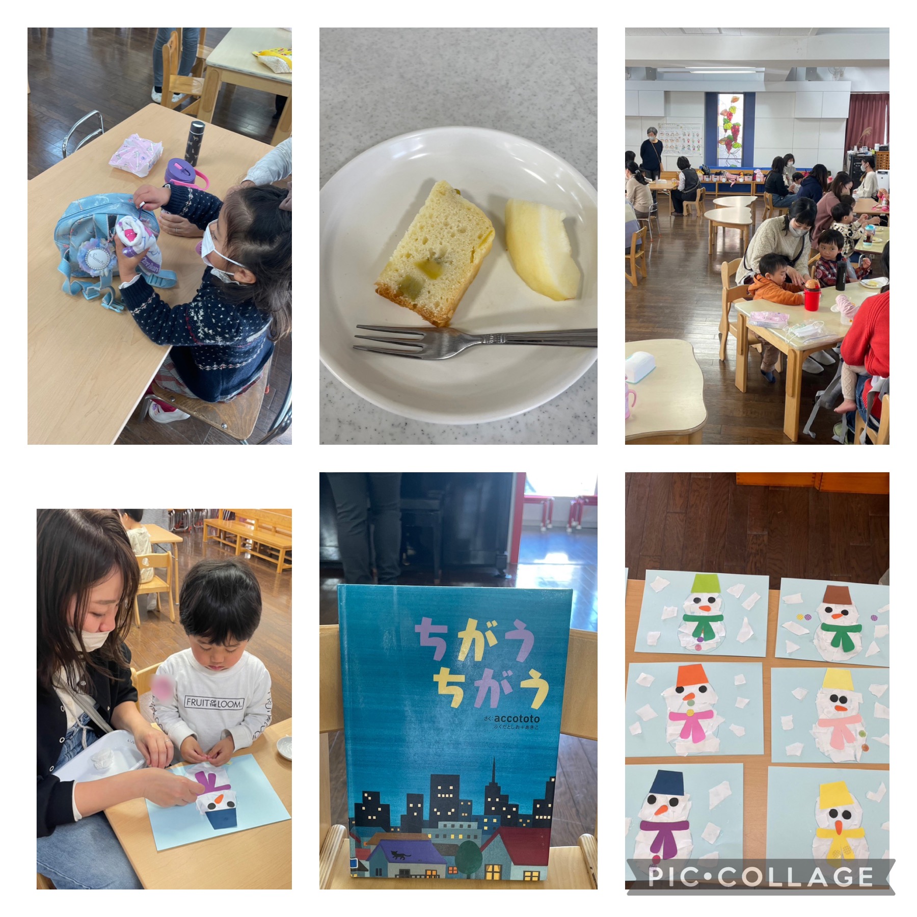 好きな色の帽子やマフラーと、目、鼻を貼って可愛い雪だるまができました。