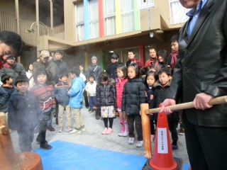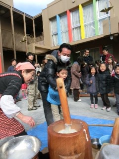 おもちつき(1月12日) お知らせ イベント 今日のひとこま 2013.01.12 おもちつきを行いました! つぶつぶのお米が、うすの中でおもちに変わっていくのを、 「よいしょ!よいしょ!!」と、みんなで掛け声をかけて応援しながら、おもちつきを楽しみました☆ つきたてのおもちを、大好きなお父さんお母さんと一緒に「いただきまーす!」 お醤油、きなこ、あんこ味のおもちをたくさんおかわりして、おもちでおなかもいっぱいに膨れました♪