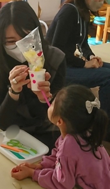 小さな紙をはさみで切って、目や口のシールを付けて、おうちの方には袋とストローをテープでとめてもらいました。