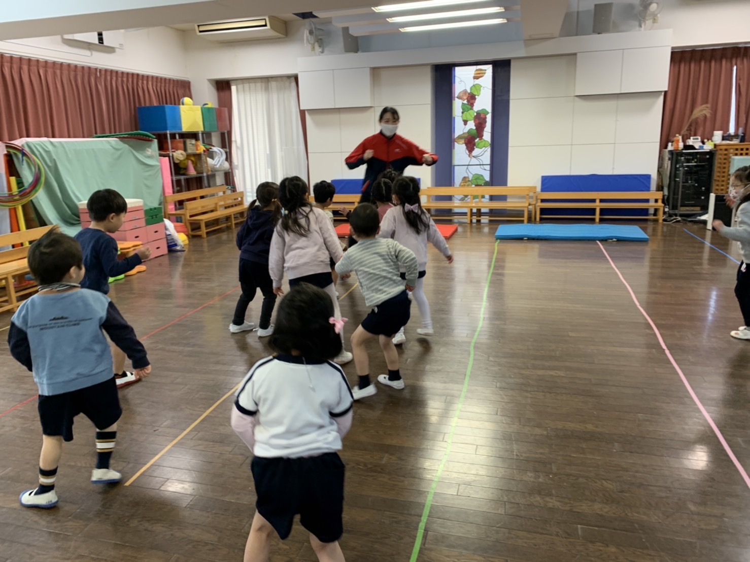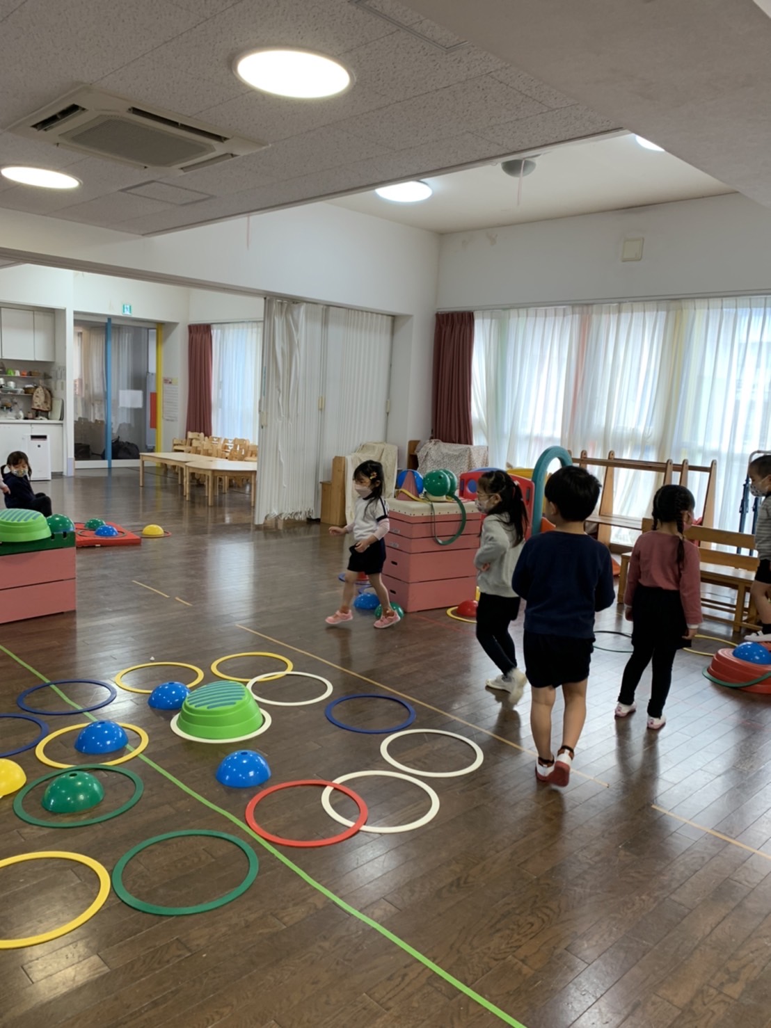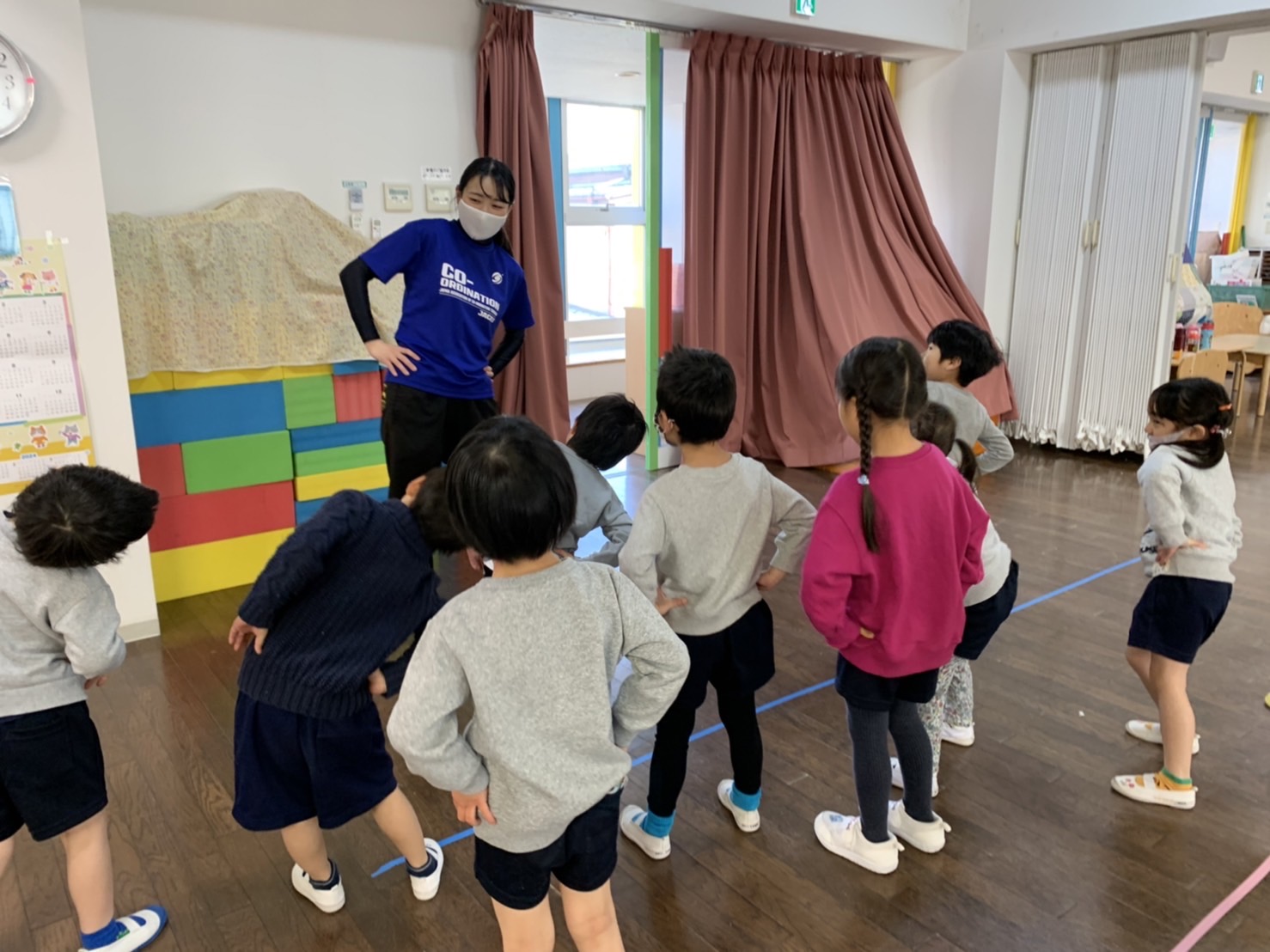 小さなボールを使った運動では、ボールを落とさないように集中している姿が見られました。難しい動きでしたが、とても上手に出来ました。プレイデーでも同じ動きをしたので、おうちの人ともぜひ挑戦してみてください。