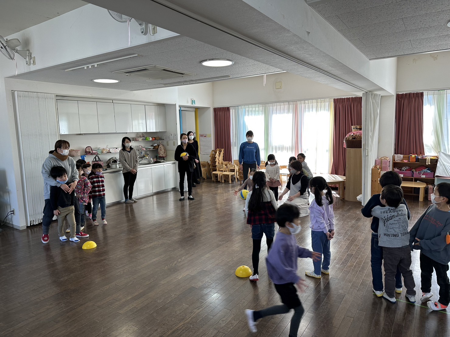 各チーム、名前を決めて「ファイト!オー!」円陣を組んで、ボールリレーをしました。「ナイス!どんまい!」かけ声が、チームを盛り上げていましたね。ありがとうございました!