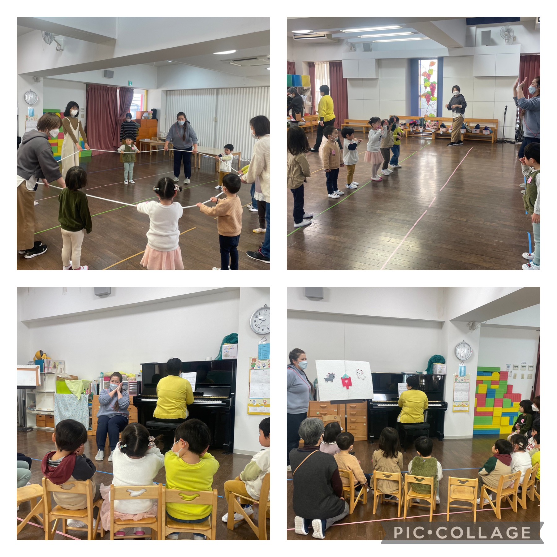 今日は、みんなで一つのロープを持ってピアノに合わせて行進しました。