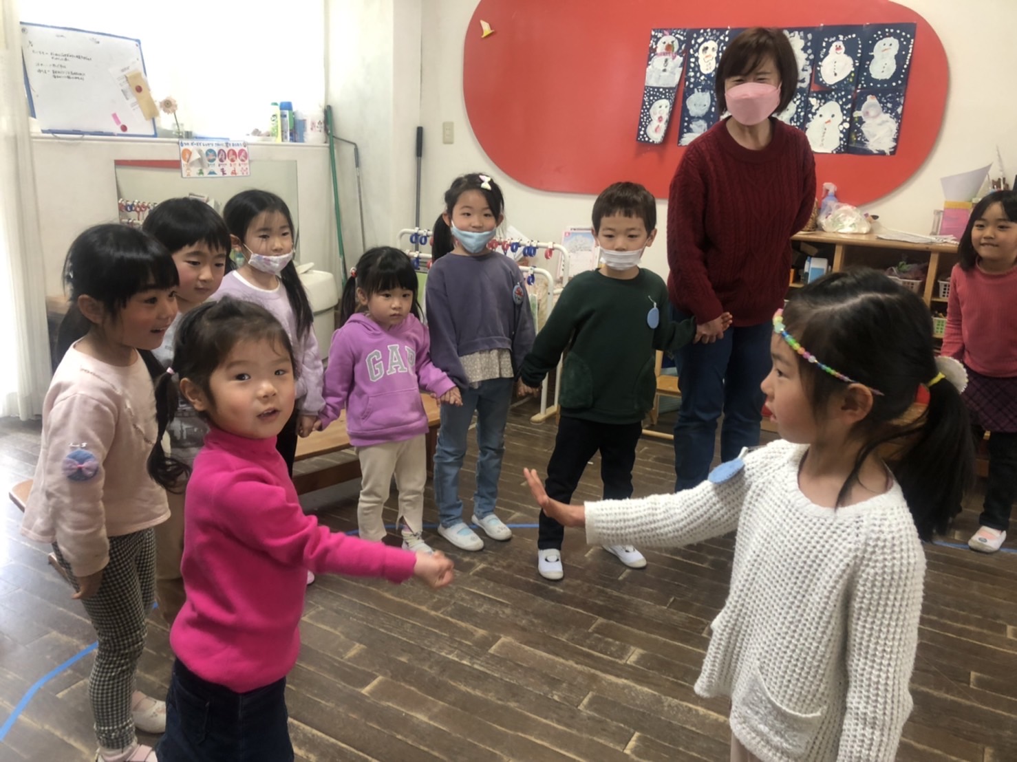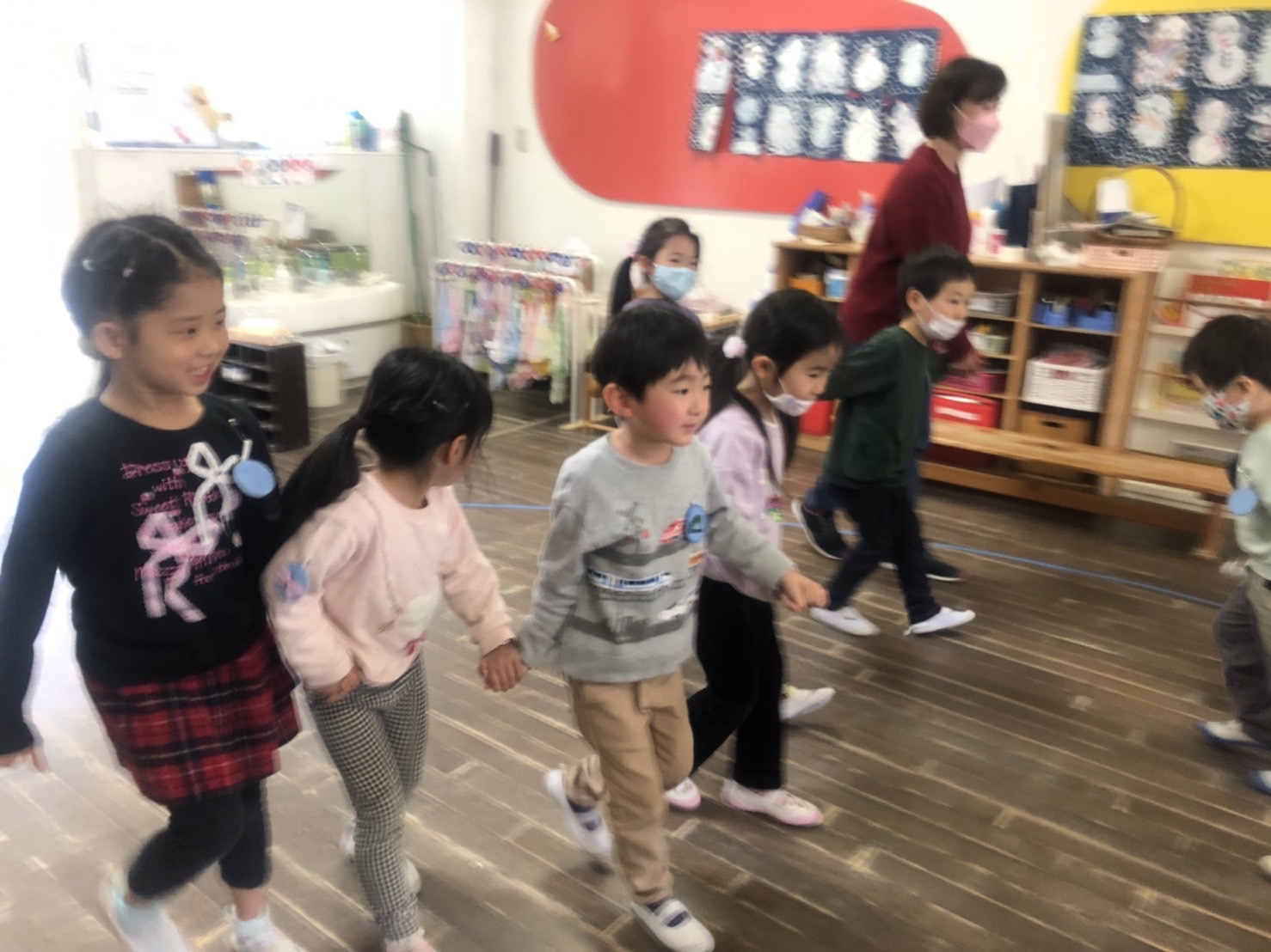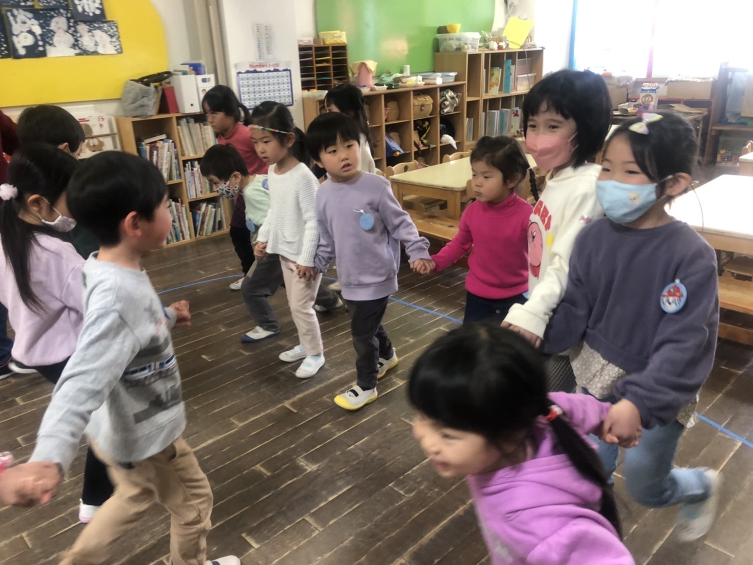 初めは、いつもと違う部屋とお友だちに緊張していましたが、グループがきっかけで普段も一緒に遊ぶようになったり、廊下で見つけると笑顔で手を振ったりと、いつの間にか仲良くなっていましたね。