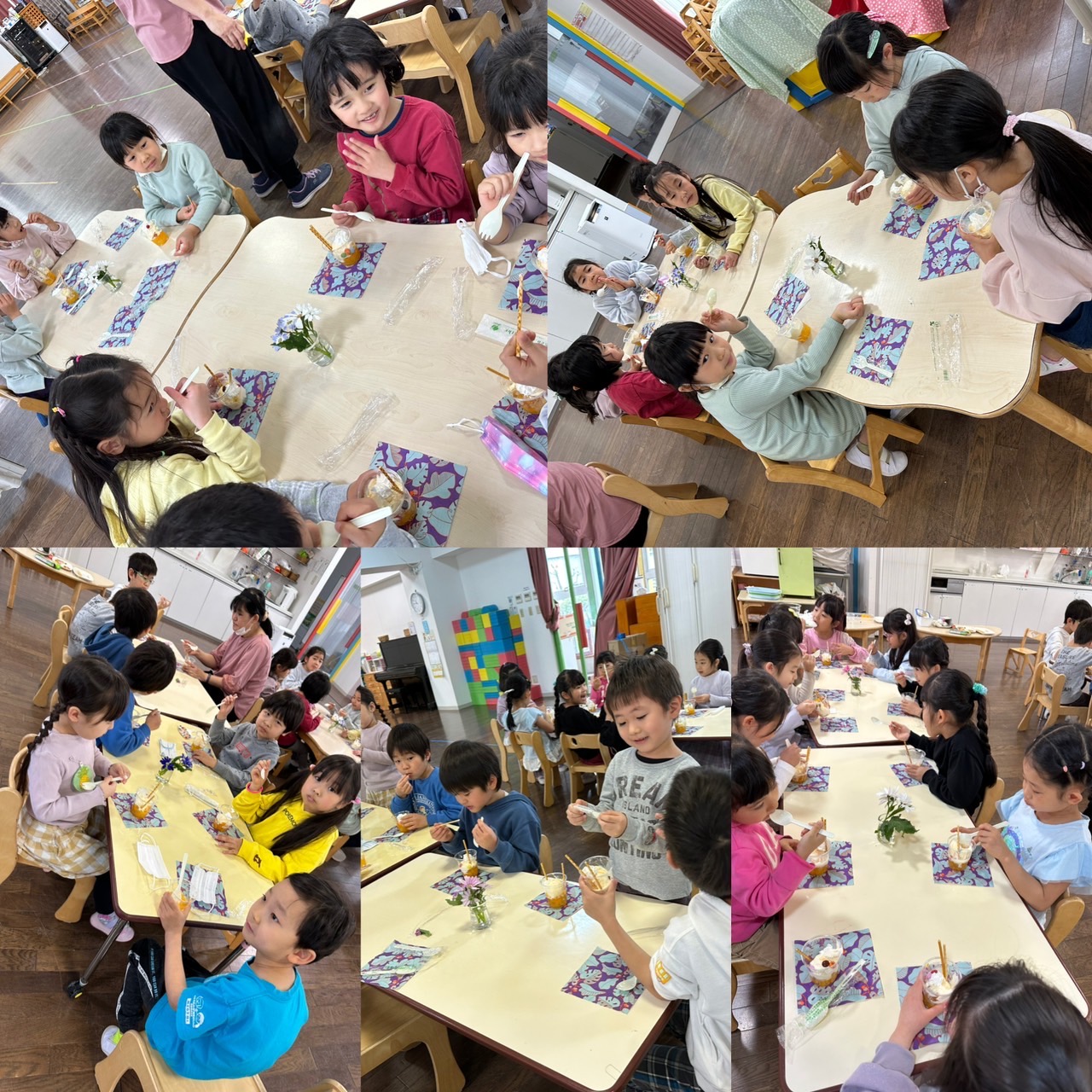 会場はホールに移動して、ページェントメンバーで席につき、特大ゼリーにバニラアイス・マーブルチョコ・生クリーム・プリッツサラダ味をトッピングしていただきました。みんなで同じおやつを分かち合って、美味しかったですね。ごちそうさまの後はページェントの歌を歌いました。