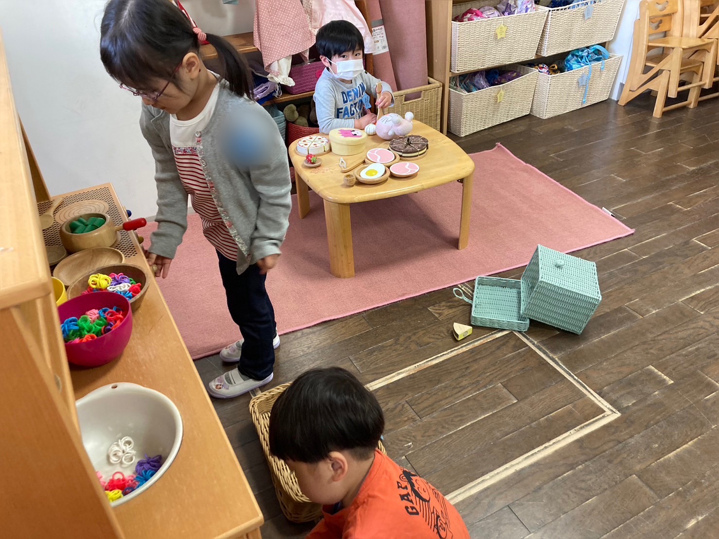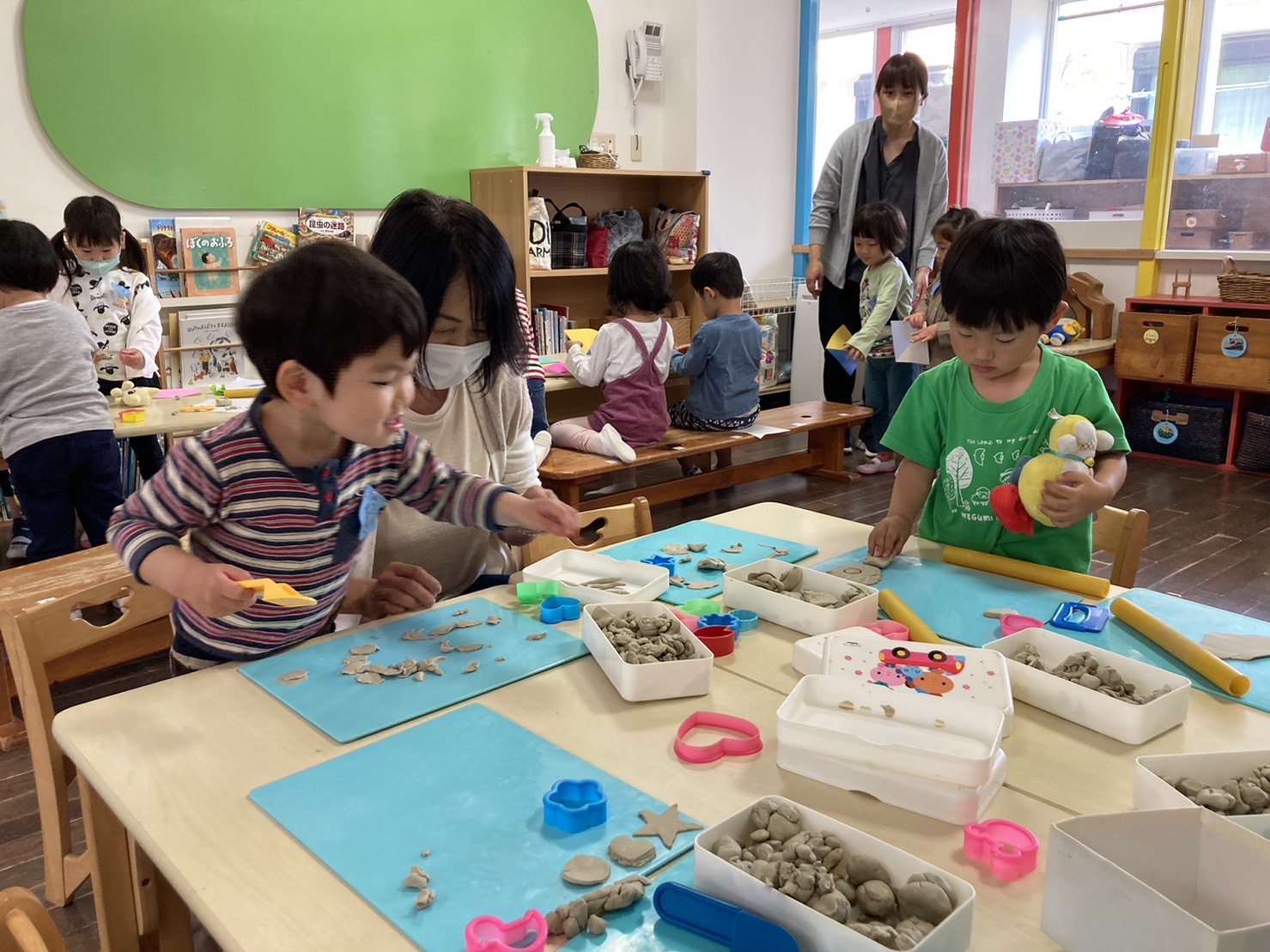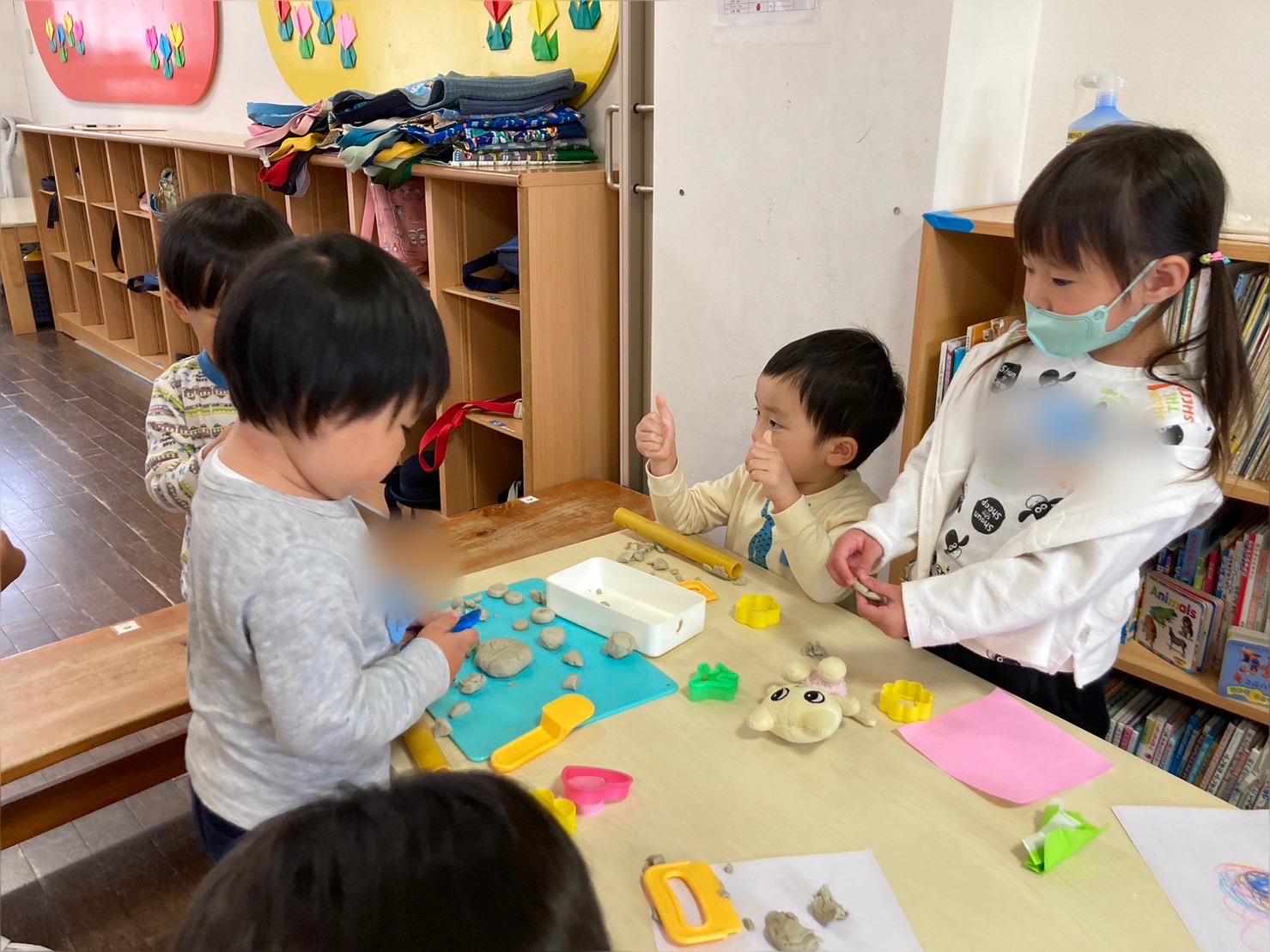自由遊びでは、もも組の頃に好きだった木のおもちゃや粘土などで遊んでいます。