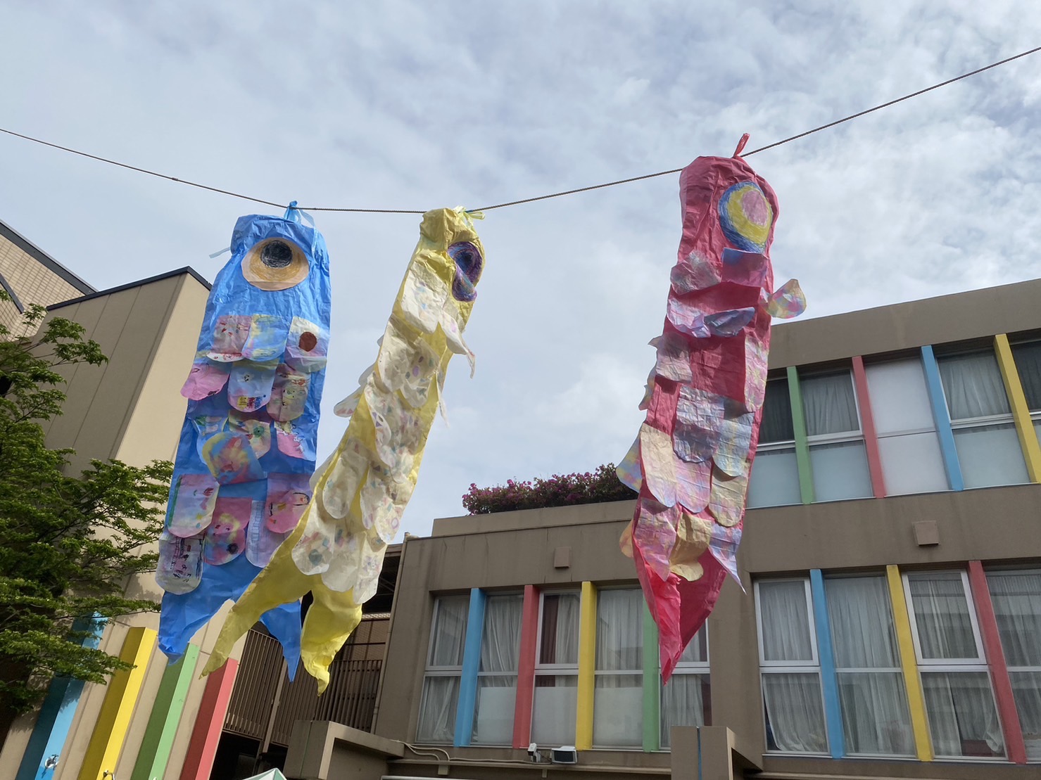 朝、さくらさんの作った3匹の大きなこいのぼりが、元気よく幼稚園のお庭の空を泳ぎ始めました。