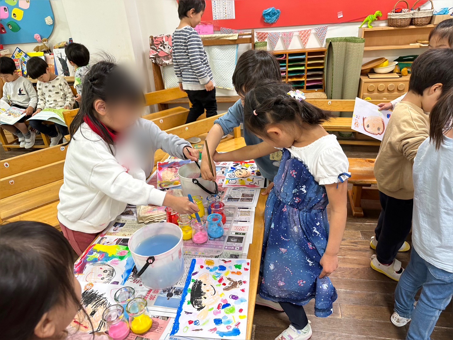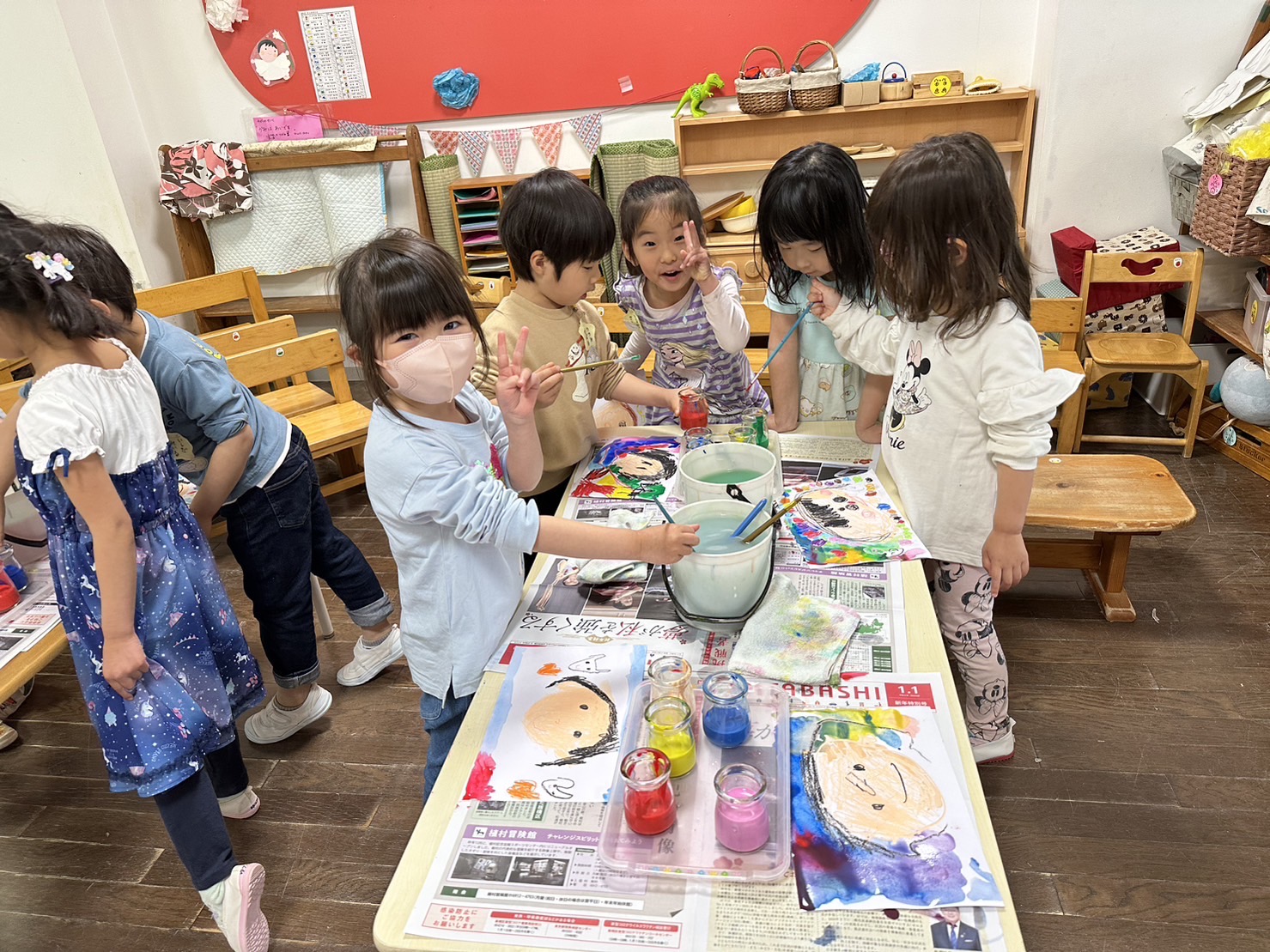 お昼ご飯をいただいて、午後から絵の具をしました。キレイな色の世界を楽しんでいましたね。お休みしているお友達が早く元気になりますようにお祈りしてます。