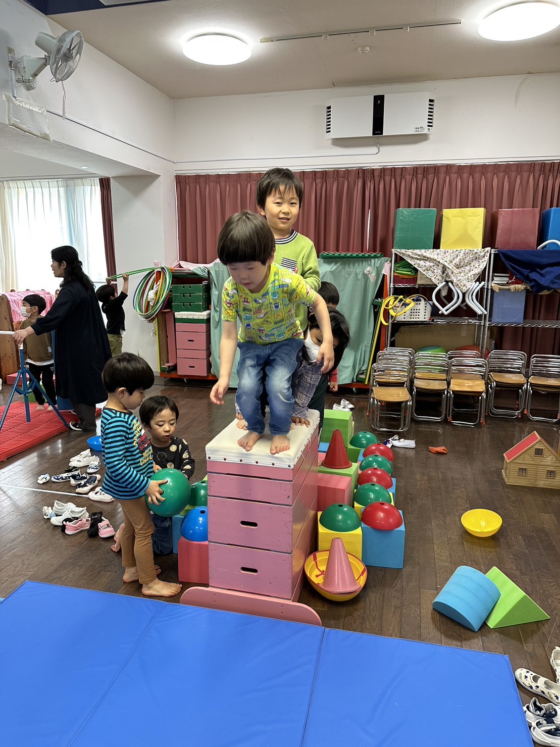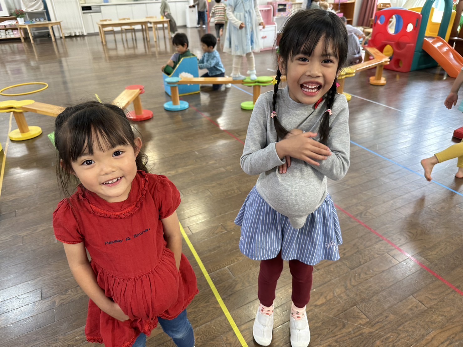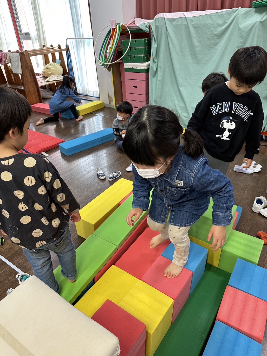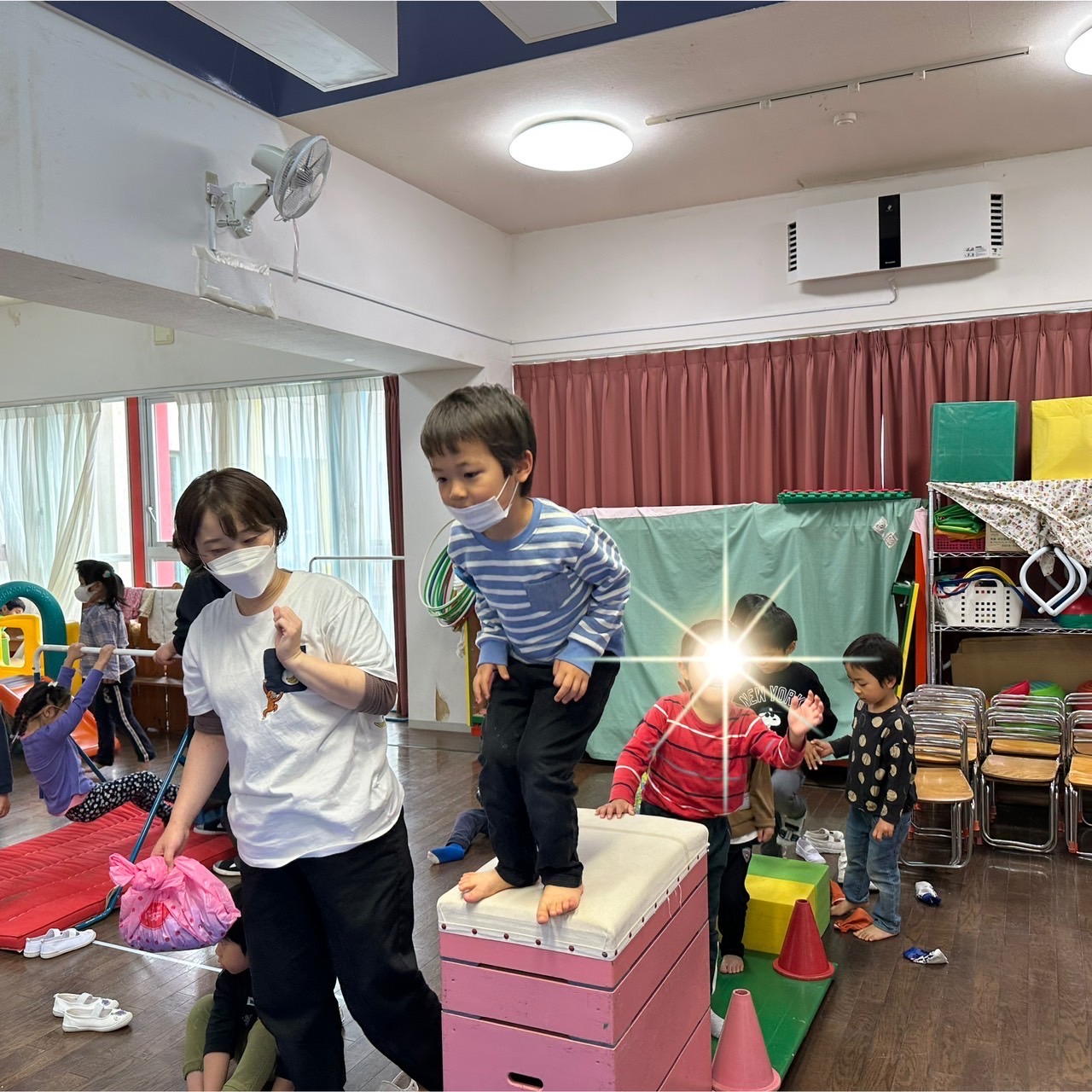 ホール遊びがだいすきな子どもたち!お腹にボールを入れてお母さんごっこをしたり、鉄棒では前回り、逆上がり練習に夢中!さくら組さんの姿をみて、憧れて挑戦するたんぽぽ組さんの姿も微笑ましいです。また明日も元気に登園できますように、おやすみのお友だち、早く幼稚園に帰ってこれますように、お祈りして待ってます。
