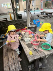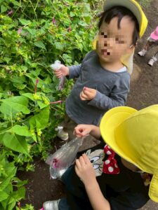 砂場でお山作ったり、滑り台滑ったり、裏庭ではおしろい花で色水遊びをしたり山を駆け登ったり。