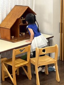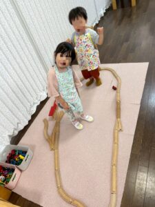 お部屋に戻ったら、“とんぼのめがね”を歌い、礼拝では讃美歌を歌ってお祈りをします。お部屋でおままごとや線路をつなげて遊んだり…⭐︎