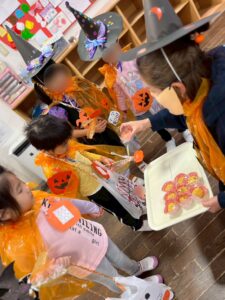 「Trick or Treat」と言うと、スタンプを押してもらえます。そして、楽しみなおやつをもらいました‼