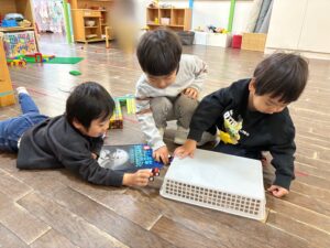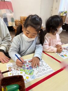 自由遊びの時間には、クリスマスの塗り絵をしたり、お友だちと仲良く遊んだりする姿が多く見られました。
